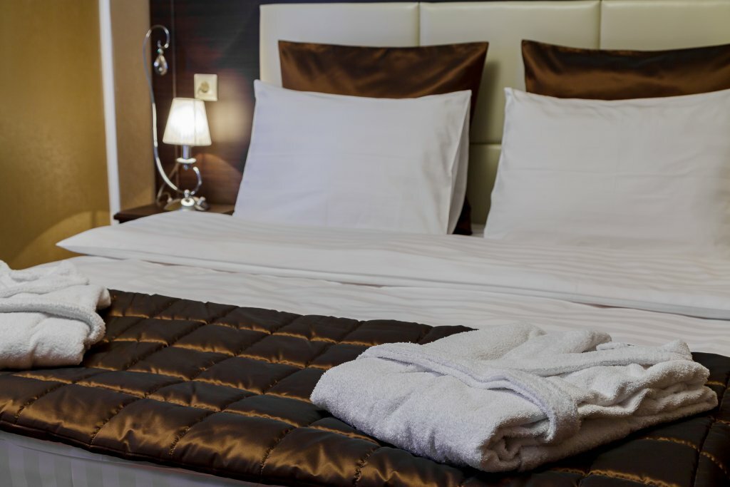 Двухместный Джуниор Сюит (полулюкс): в номере двуспальная кровать, прикроватные тумбочки с персональным освещением, декоративный диван (как доп.место не предоставляется), стол с пуфом, мини-холодильник, чайник, телевизор, шкаф-купе для одежды с вешал