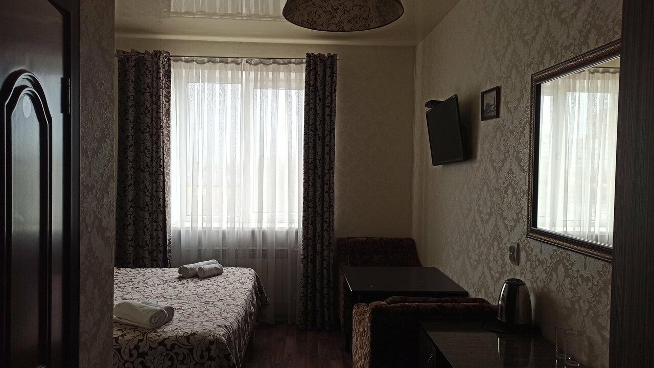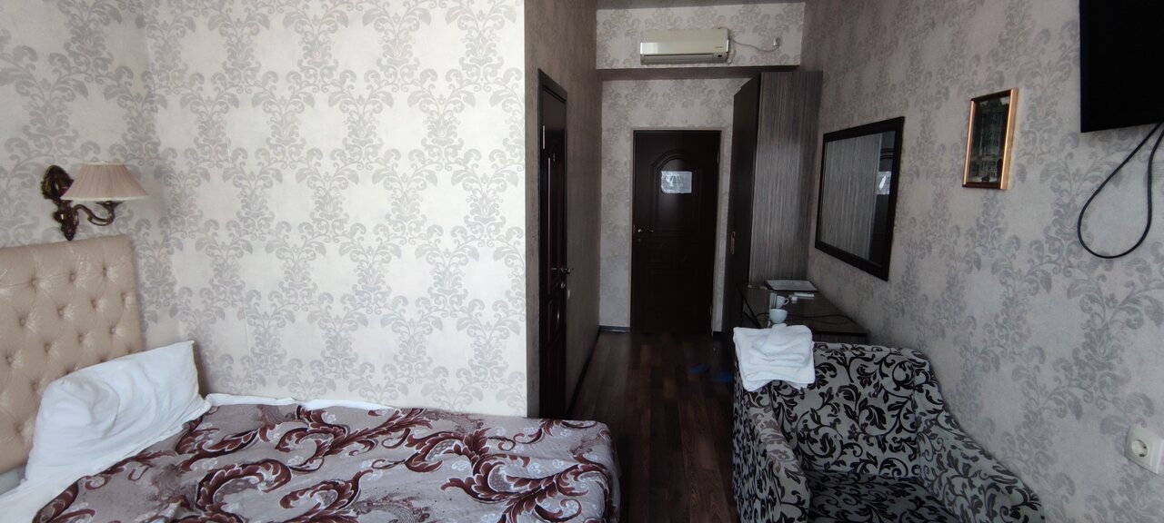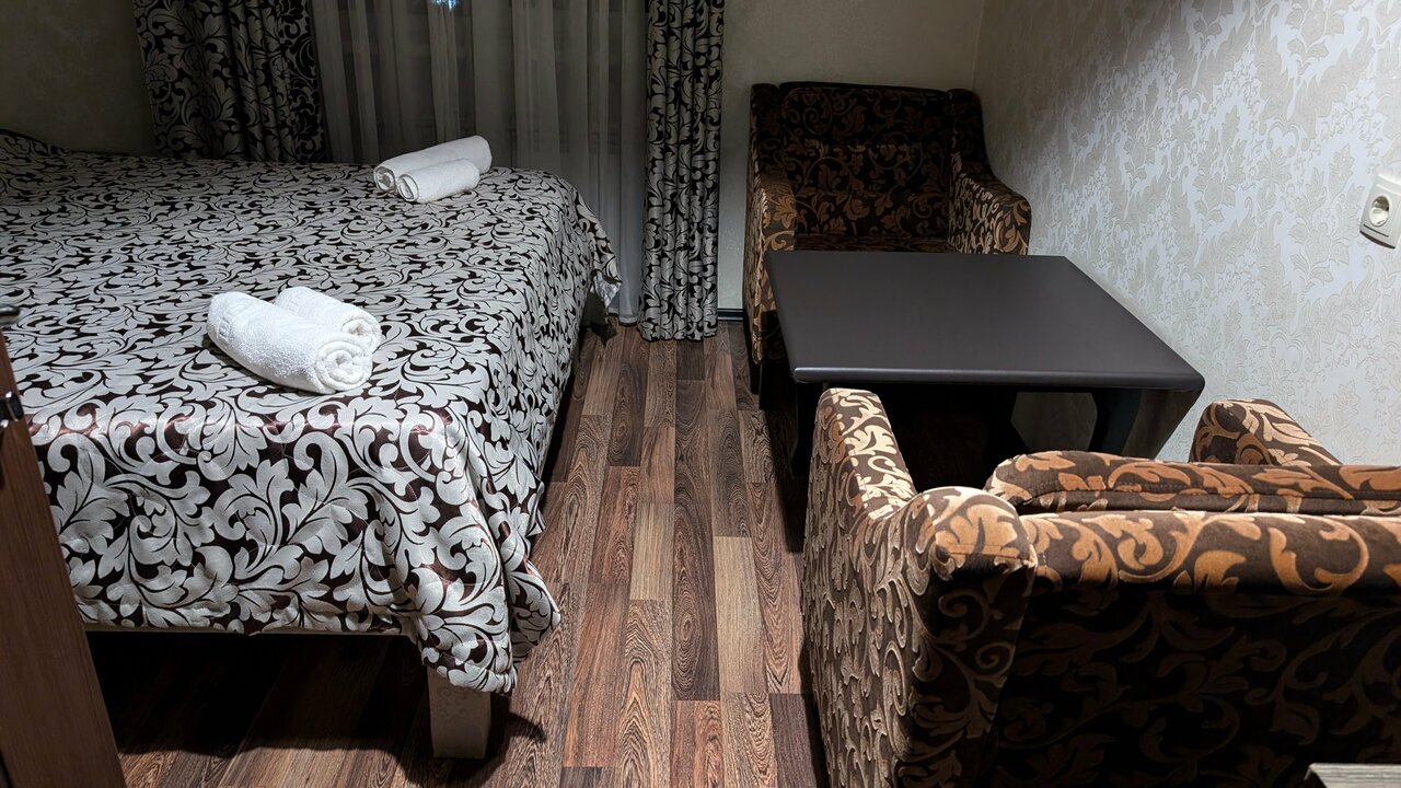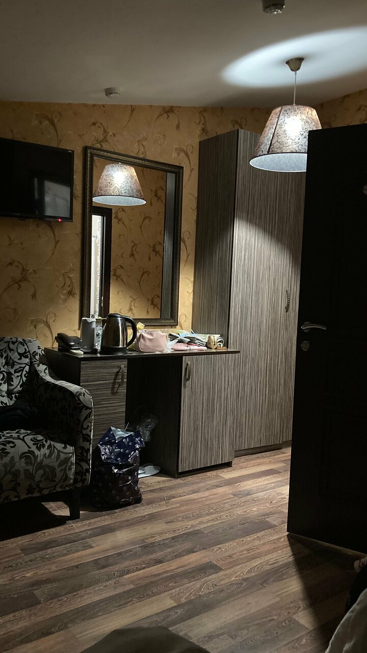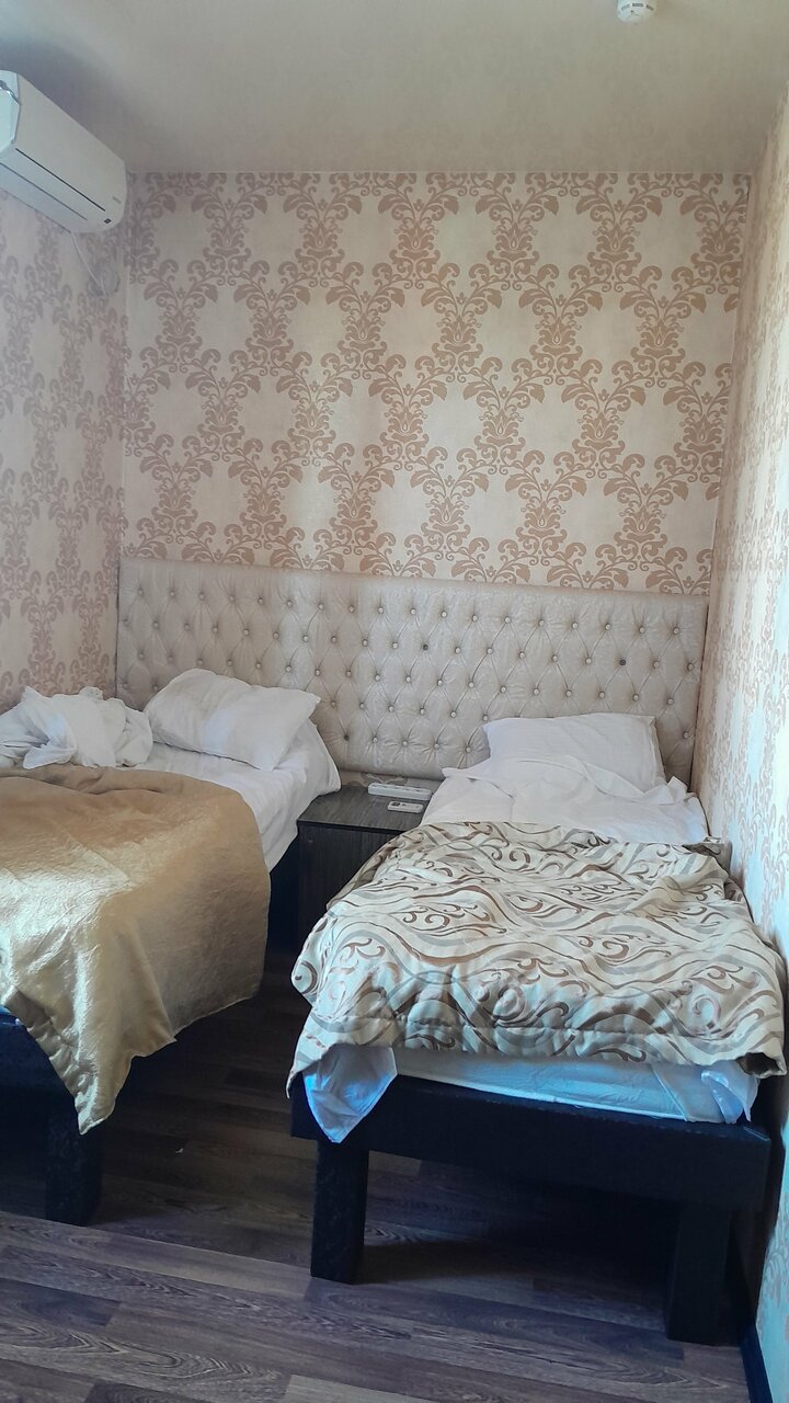 Отель для тех кто ищет ночлег на 1-2 ночи. Есть душ, выдают по просьбе чайник. В номере есть холодильник. В нашем номере было ощущение что номер убран очень давно, в воздухе чувствовалась пыль. Полотенца показались не первой свежести. Мало розеток. В одном бра не было лампочки. Но кровати 2 и они не одноместные а полуторки. На каждой спокойно смогут поместиться по два человека. Я спал с сыном на одной на второй жена и дочь. Завтрак шведский стол хороший. Была манная каша яйца нарезки из сыра и ветчины. Вкусный морс, пакетированный кофе и чай в добротный бумажных стаканах. Были шоколадные шарики и кукурузные хлопья с молоком. Трм вида пирожных медовик ванильный с варёной сгущёнкой и пирожные с кремом. Очень достойный выбор. Бронировали через букинг за 2250 рублей сутки. Хорошее соотношение цены и качества. Минус звезда за чистоту номера. Кондиционер тоже есть.