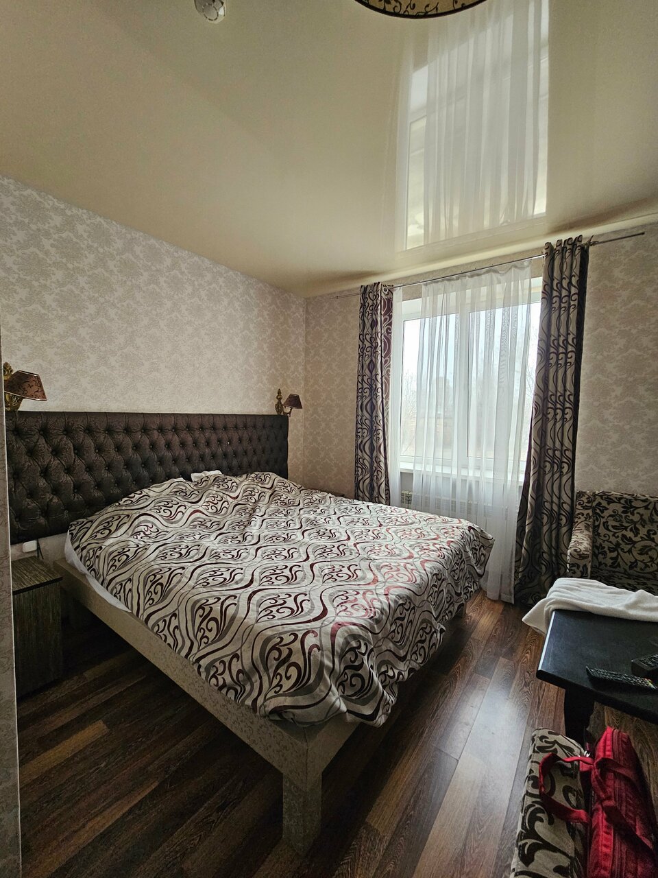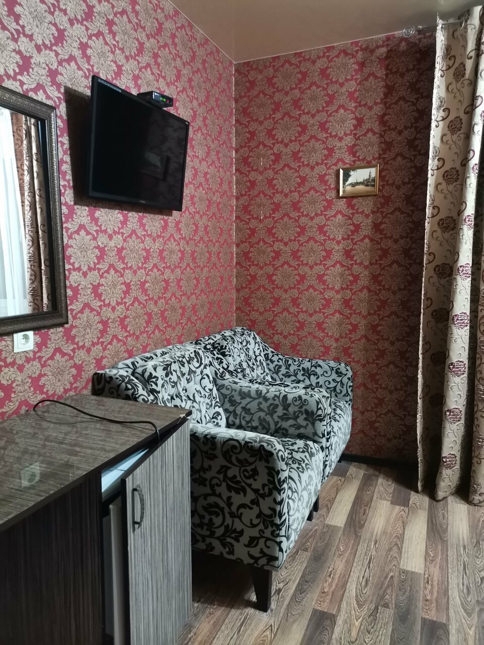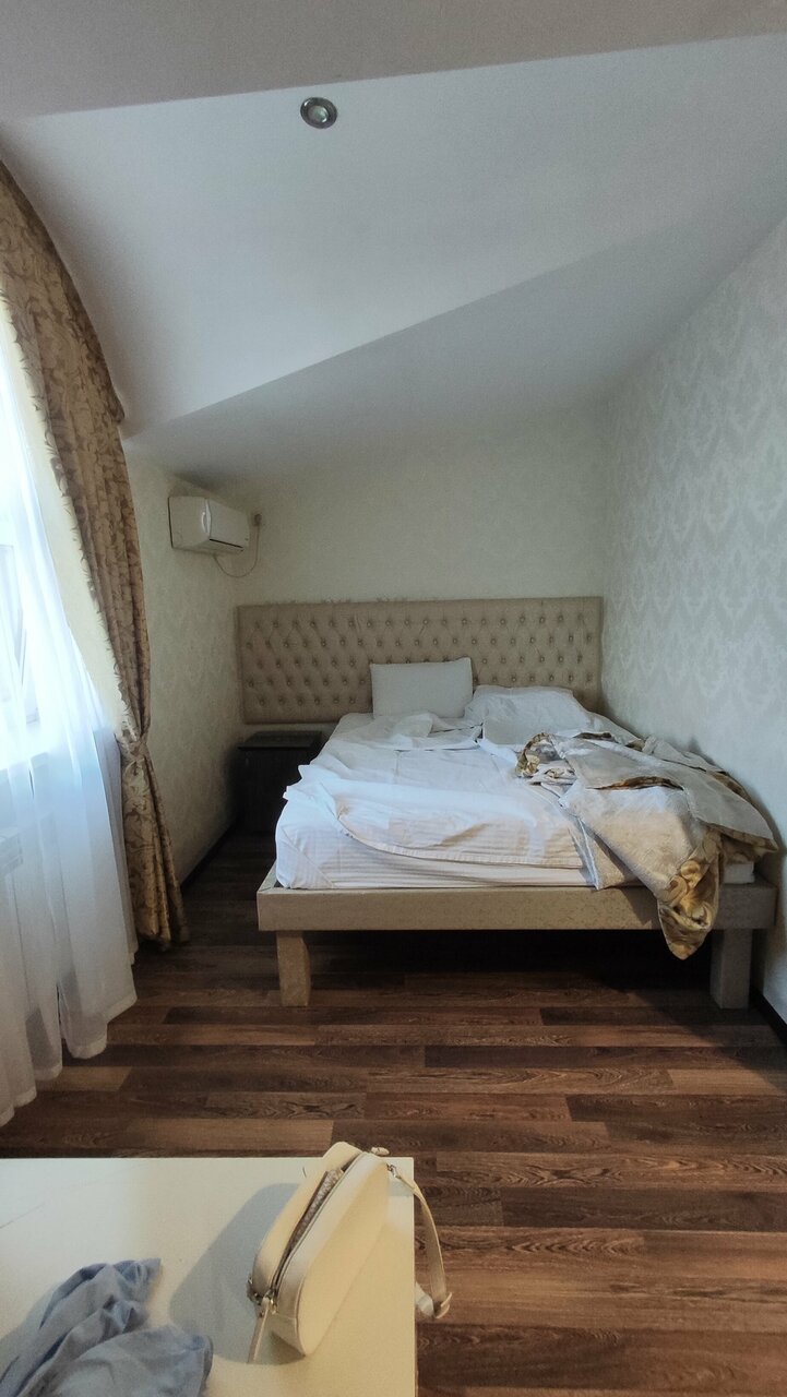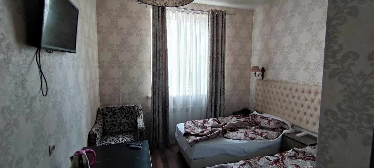 Отель для тех кто ищет ночлег на 1-2 ночи. Есть душ, выдают по просьбе чайник. В номере есть холодильник. В нашем номере было ощущение что номер убран очень давно, в воздухе чувствовалась пыль. Полотенца показались не первой свежести. Мало розеток. В одном бра не было лампочки. Но кровати 2 и они не одноместные а полуторки. На каждой спокойно смогут поместиться по два человека. Я спал с сыном на одной на второй жена и дочь. Завтрак шведский стол хороший. Была манная каша яйца нарезки из сыра и ветчины. Вкусный морс, пакетированный кофе и чай в добротный бумажных стаканах. Были шоколадные шарики и кукурузные хлопья с молоком. Трм вида пирожных медовик ванильный с варёной сгущёнкой и пирожные с кремом. Очень достойный выбор. Бронировали через букинг за 2250 рублей сутки. Хорошее соотношение цены и качества. Минус звезда за чистоту номера. Кондиционер тоже есть.