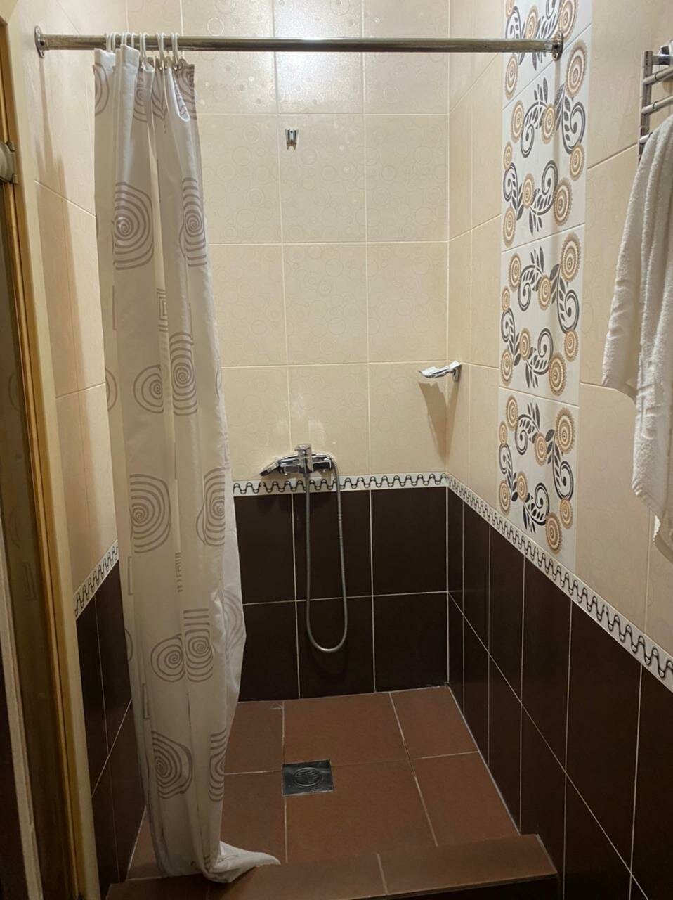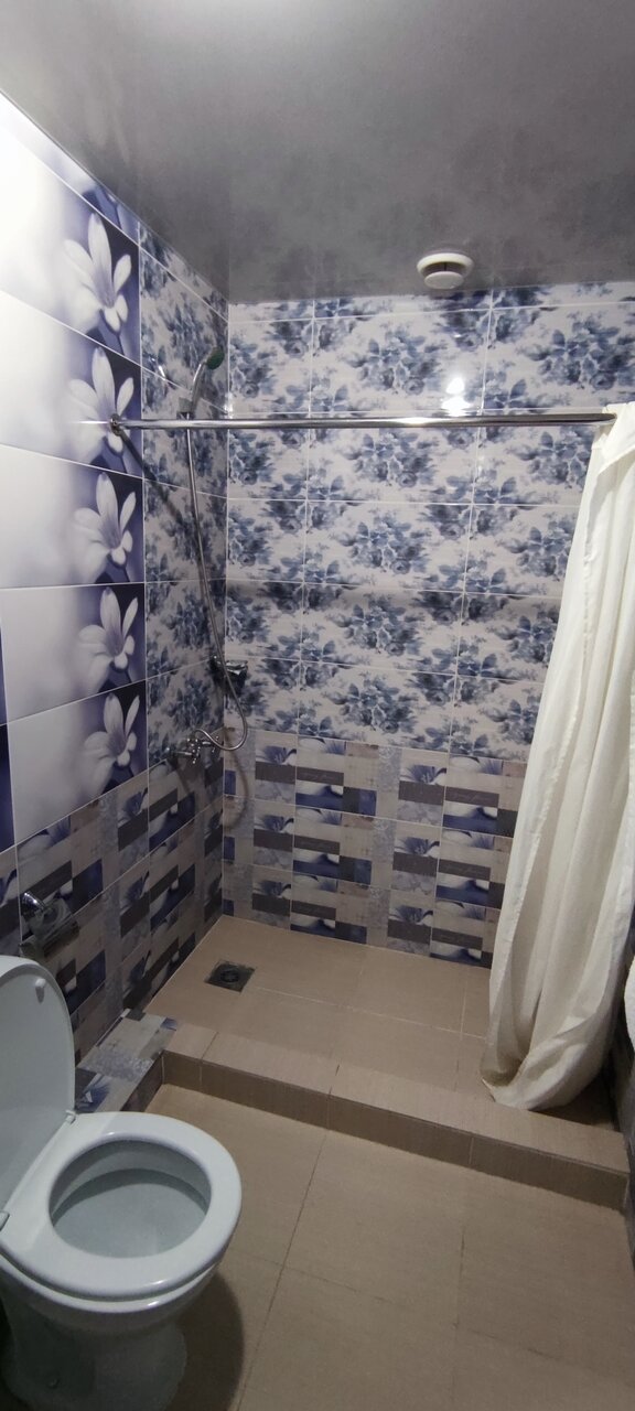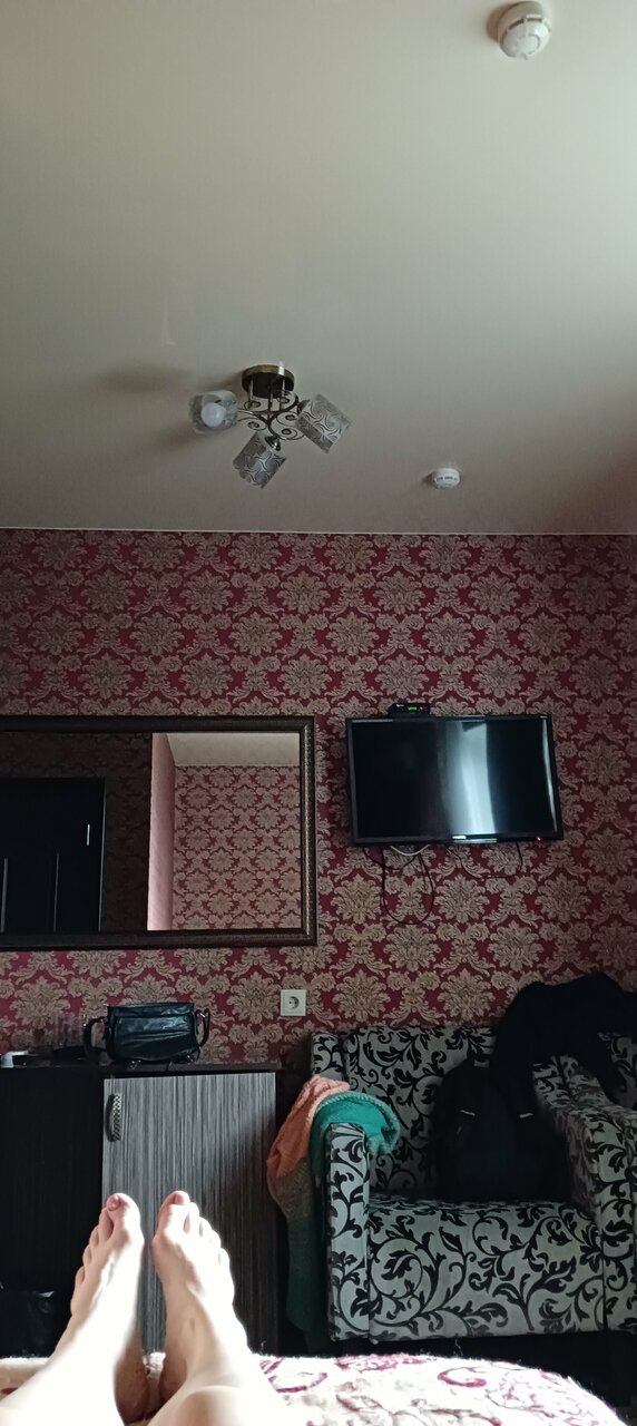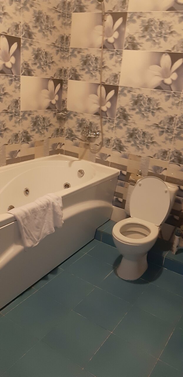 Комната уютная, но кровати подранные. Обои расползаются. Телевизор не плохой, но звук управляеться одним пультом, а программы другим. Хотя у нас так и не получилось сменить канал, наслаждались ТНТ. Душевая комната большая. Но душ прикручен под потолком и струя бьёт высоко над головой в стену. Так что чтобы помыться надо душ держать в руках. Вид из окна тоже оставляет желать лучшего. Мы наслаждались видом на стоянку. Номер 1-7.