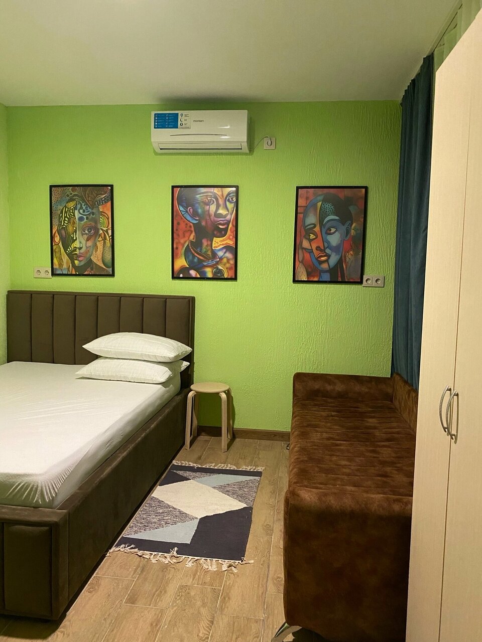 Уютно, чисто. В номере есть всё необходимое: кондиционер, холодильник, микроволновка, плита, телевизор, wi-fi,посуда, постельное белье, полотенца и т.д. В нашем двухкомнатном номере (апартаменты) двуспальная кровать и 2 раздвижных дивана. Парковки как таковой нет, но авто можно поставить возле здания и оно будет под камерой видеонаблюдения. Единственный минус — спальный район в частном секторе (утром кричит петух), дорога к отелю грунтовая с ямами, но она короткая, и в округе нет кафе, но зато в этом же здании есть магазин. А в общем, не плохой бюджетный вариант.