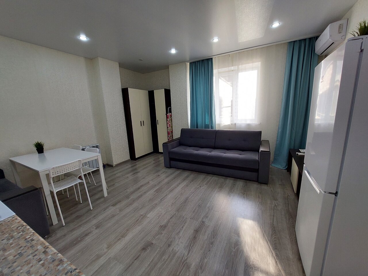 Очень чисто. Новый жилой комплекс. Удобно расположен рядом с с центральным проспектом. Закрытая территория, детские площадки. До Мамаева кургана 10 минут на авто. Рекомендую