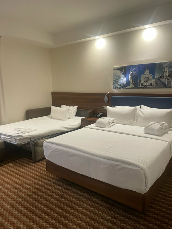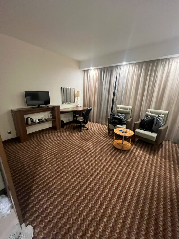 Жили в 114 номере одну ночь с 16.09 Принадлежности (тапочки, щетка и пр.) на 1 человека, хотя заселялись и бронировали на двоих Кровать хорошая, матрас отличный Из минусов: в душе шланг держится на честном слове около лейки. В душевой в углах черные пятна. Вода с пола уходит плохо. Чашка оказалась грязной. Завтрак более менее, но в хилтоне краснодар, в котором жили несколькими днями ранее, качество гораздо лучше (там, например, была рыба на завтрак, а само проживание стоило дешевле на 1500р). И самого отеля, и еды. Складывается впечатление возрастного отеля, в котором ощущение свежести отсутствует во всем, кроме постельного белья.