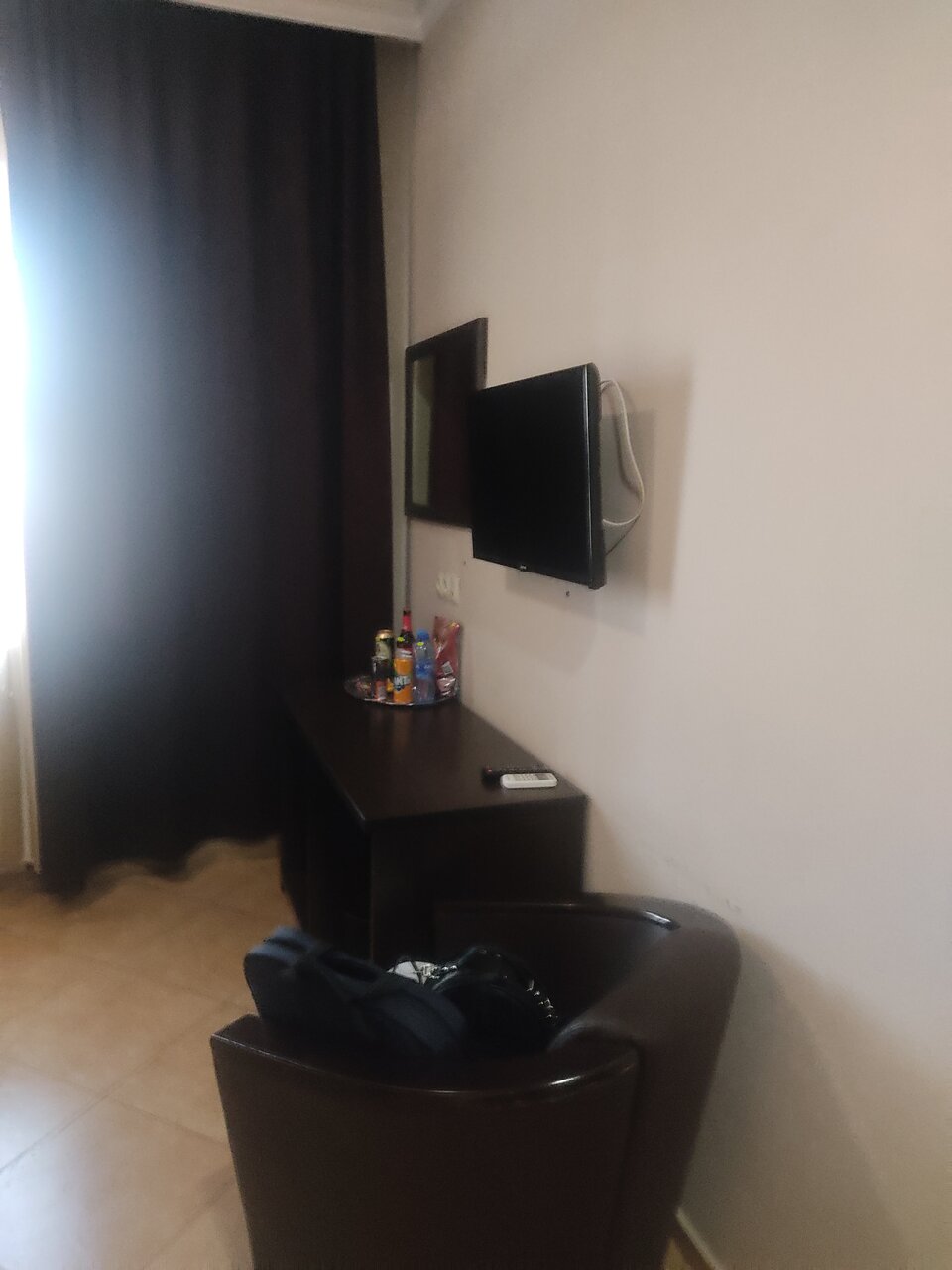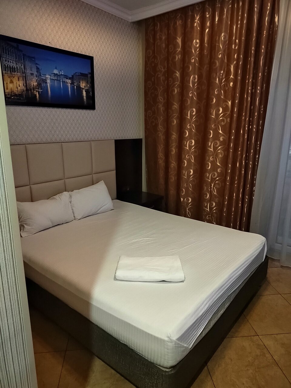 В целом отель неплохой. По запросу дали чайник, полотенце, простынь. Кружек не было- были бокалы. Чисто, кондёр работает, телевизор. Цена приемлима.