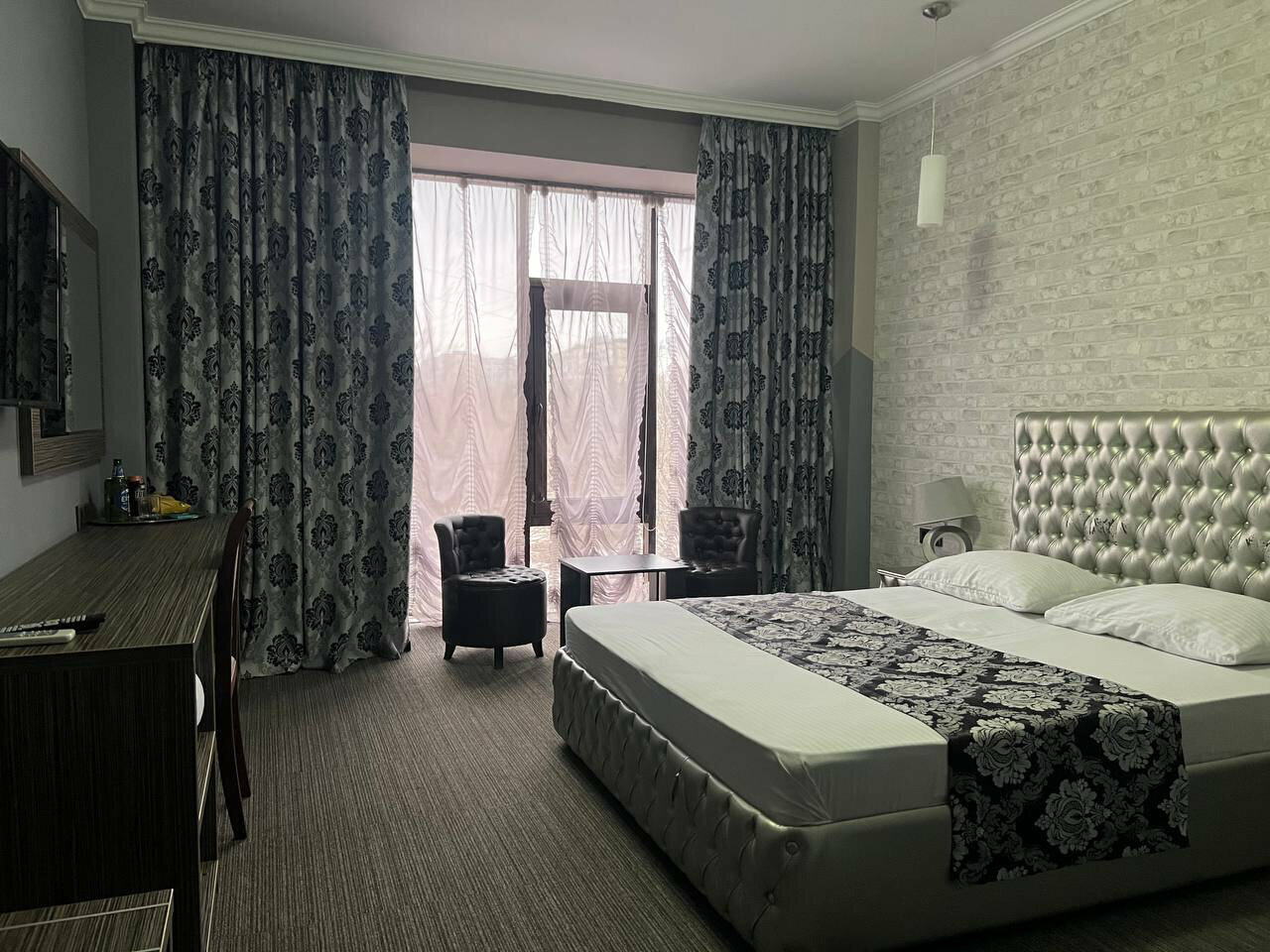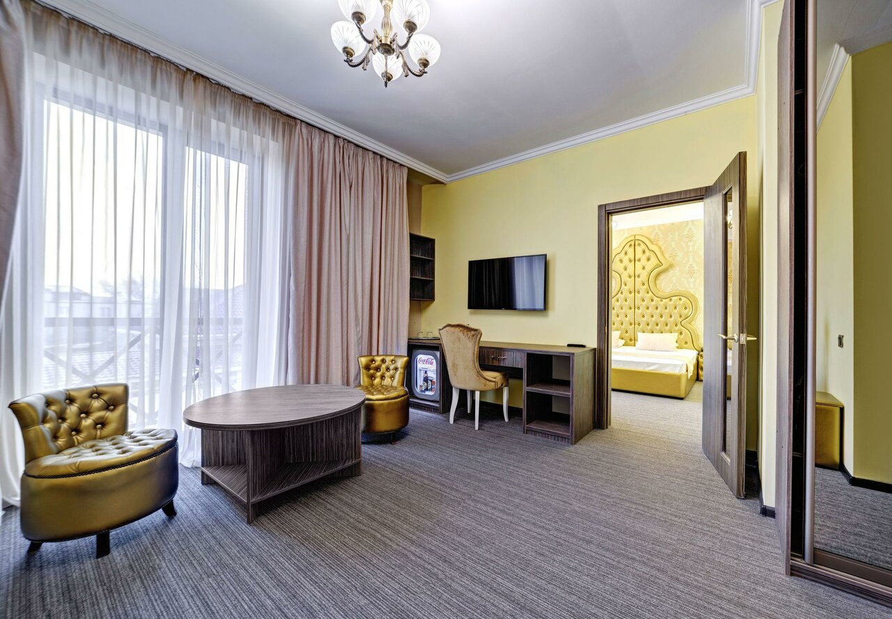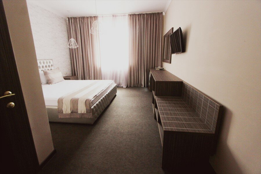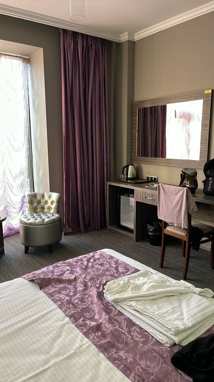 Гостиница для одного помещения. Снимали люкс. Номер 310. Были три дня и в номере ни кто не убирался. Даже не менялись полотенца. Из гигиенических средств было только три пакетика шампуня. Это на трёх человек и на три ночи. Мебель вполне комфортная. Постельное белье чистое. Было три одеяла, но одно пришлось постелить на диван, т к. с простынью просто не комфортно, т.к. диван кожаный. Магазины в шаговой доступности. Передвигались на такси без проблем. Есть бесплатная стоянка.