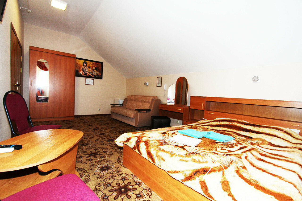 Удобства: — Номера (600–2500 ₽/ночь) с кондиционером, холодильником, TV, Wi-Fi; общие туалеты и кухня. — Крытый бассейн с баром, сауна, баня, бильярд, прачечная. — Бесплатная парковка/гараж, трансфер (аэропорт), прокат спортинвентаря. — Разрешено проживание с животными.