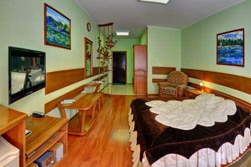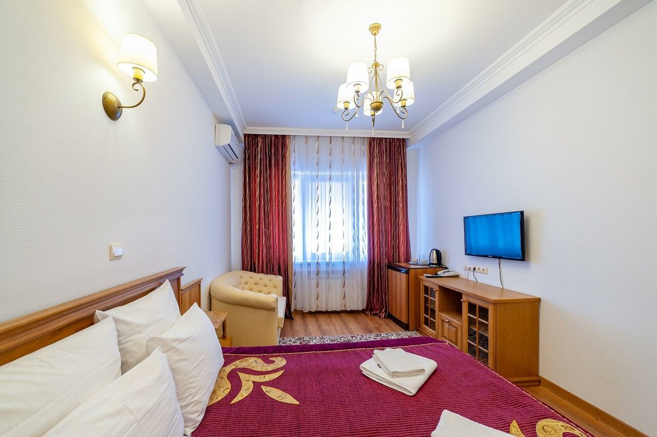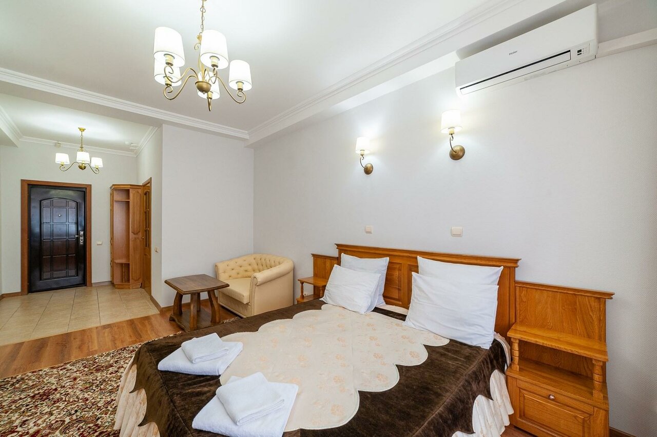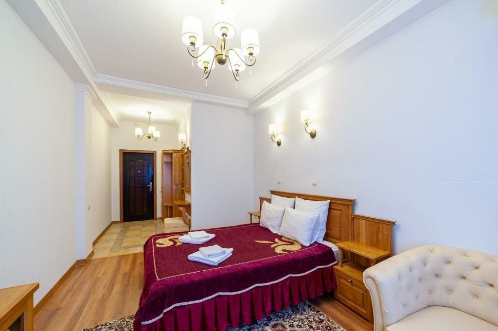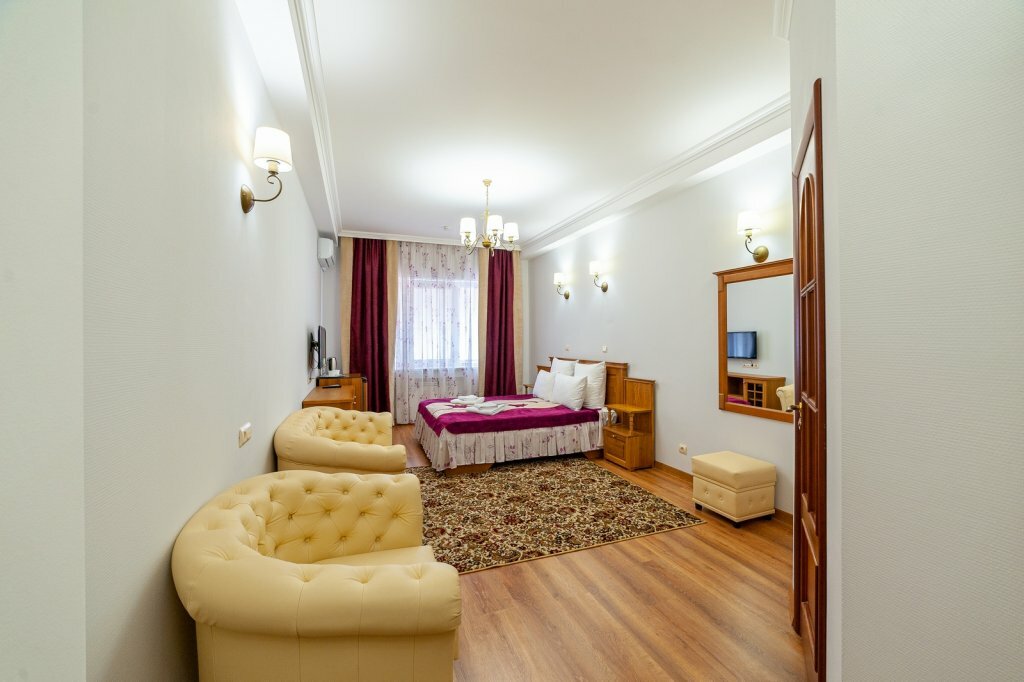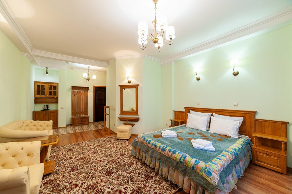 В номере: двуспальная кровать с удобным матрасом, диван, кресла,телевизор, холодильник, сплит-система, гигиенические принадлежности, напольная вешалка для костюма, чайный набор.