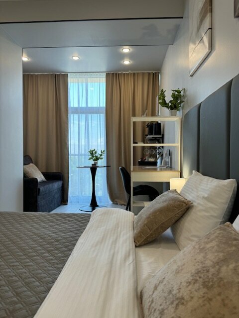 Чисто, уютно, комфортно, нет ощущения брезгливости. Стильно. Парковка, большая. Удобно, если вы на своей машине путешествуете. Рядом парк. 5-10 минут на такси — основные достопримечательности. Очень комфортная связь с администратором, заботливо. На первом этаже кафе, чтобы позавтракать. Консьерж, безопасно. Кофемашина капсульная. Фильтр для питьевой воды. Мы были в номере побольше, где есть небольшая кухня и холодильник.