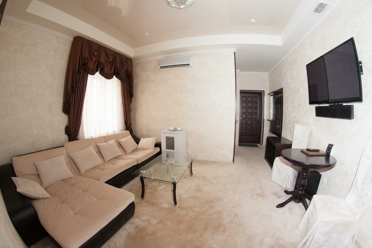 Номер 33 м2. Двухспальная кровать, диван-кровать, санузел, душ, телевизор, холодильник, кондиционер, Шкаф, сейф, чайник, чайная пара, фен, балкон с видом на море. количество номеров -8.