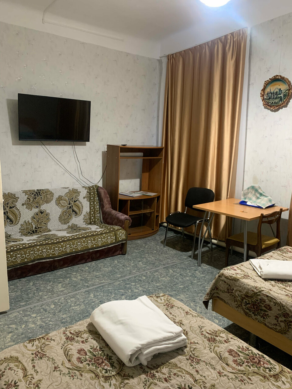 Для переночевать и поехать дальше, нормально. Номер 6, советская обстановка, но чистенько, две кровати совмещённые в одну и одна дополнительно. Полотенца, один коплект правда, бельё пастельное, чистое, хорошее. Телевизор с 5 или 6 каналами, холодильник, чайник, 3 чашки, графин, пара стульев, стол. Ванна, а точнее душ. Горячую воду надо спускать, но мы этого момента не дождались и мылись в комнатной температуры воде. Охраняемая, закрытая парковка на территории. Да, есть Wi-Fi.