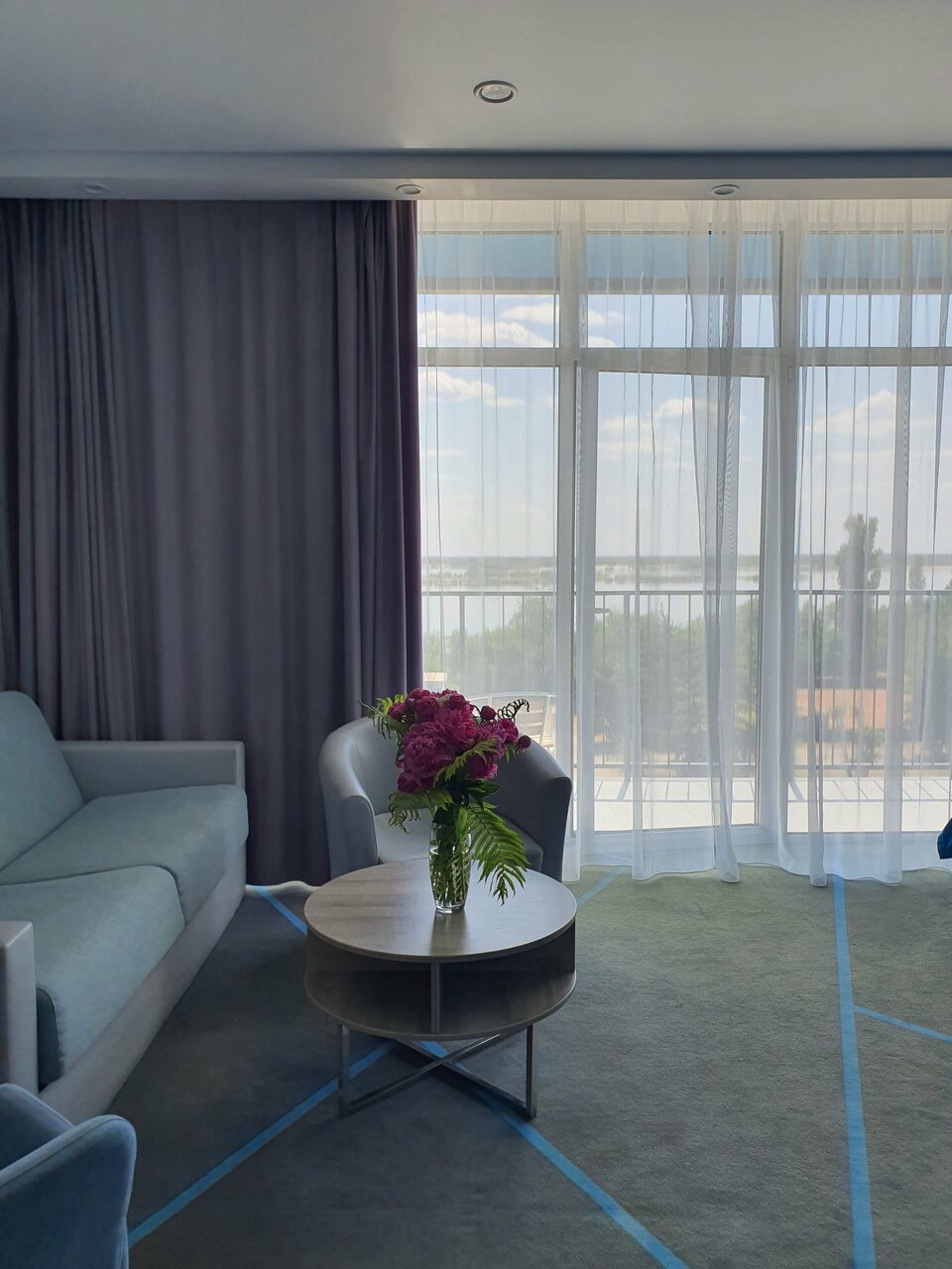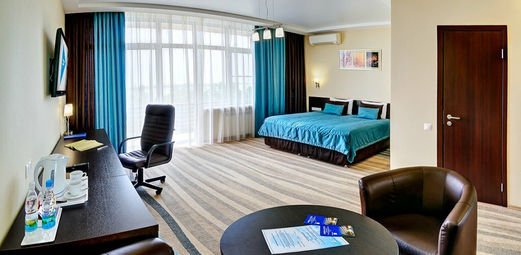 Пространство номера: одна комната, санузел.Кровать queen-size, два прикроватных столика, журнальный столик, два кресла, рабочий и рабочее кресло, шкаф-купе, стол и стулья на лоджии. Сплит-система, сейф, фригобар, цифровое ТВ, утюг и гладильная доска