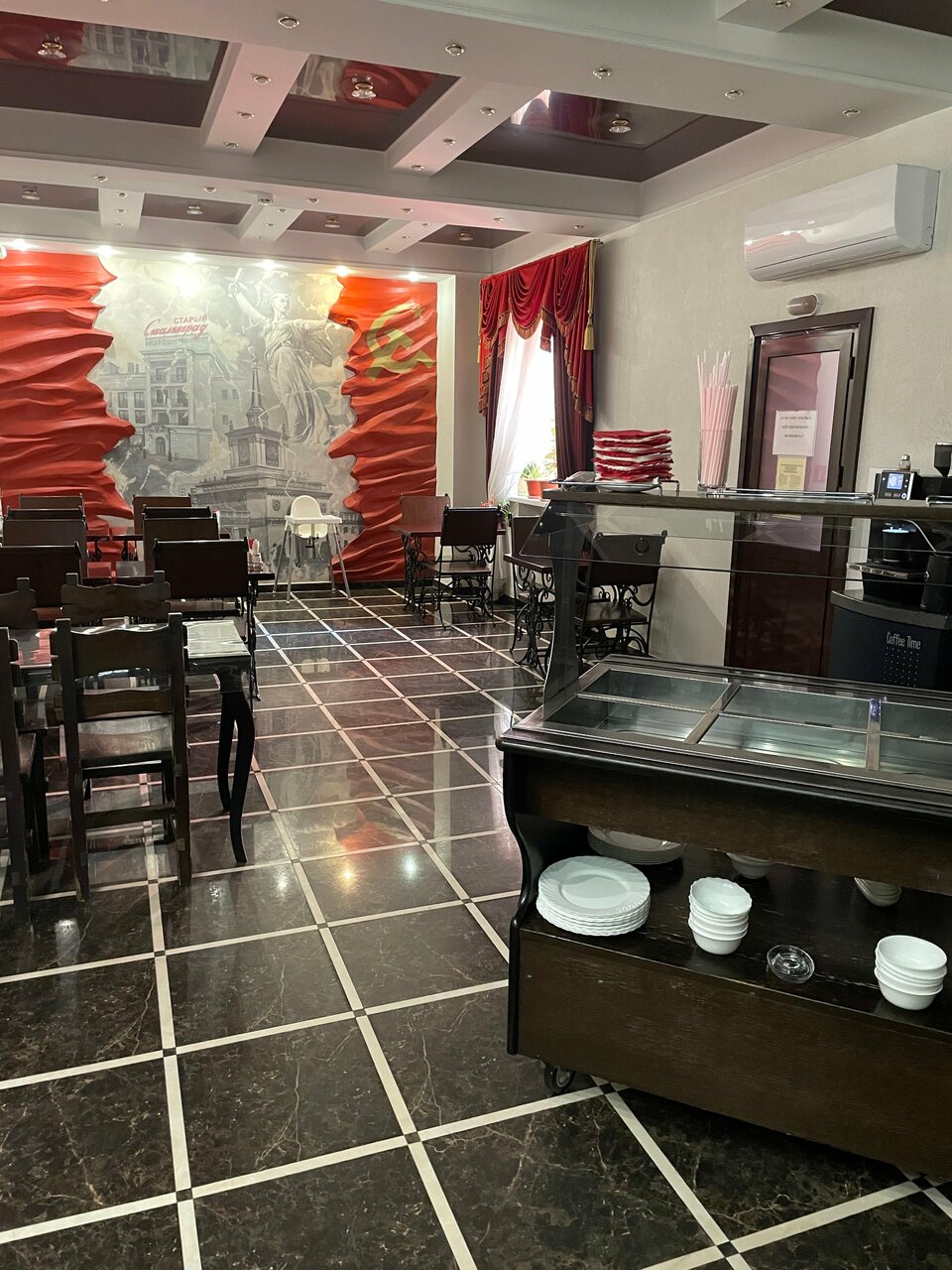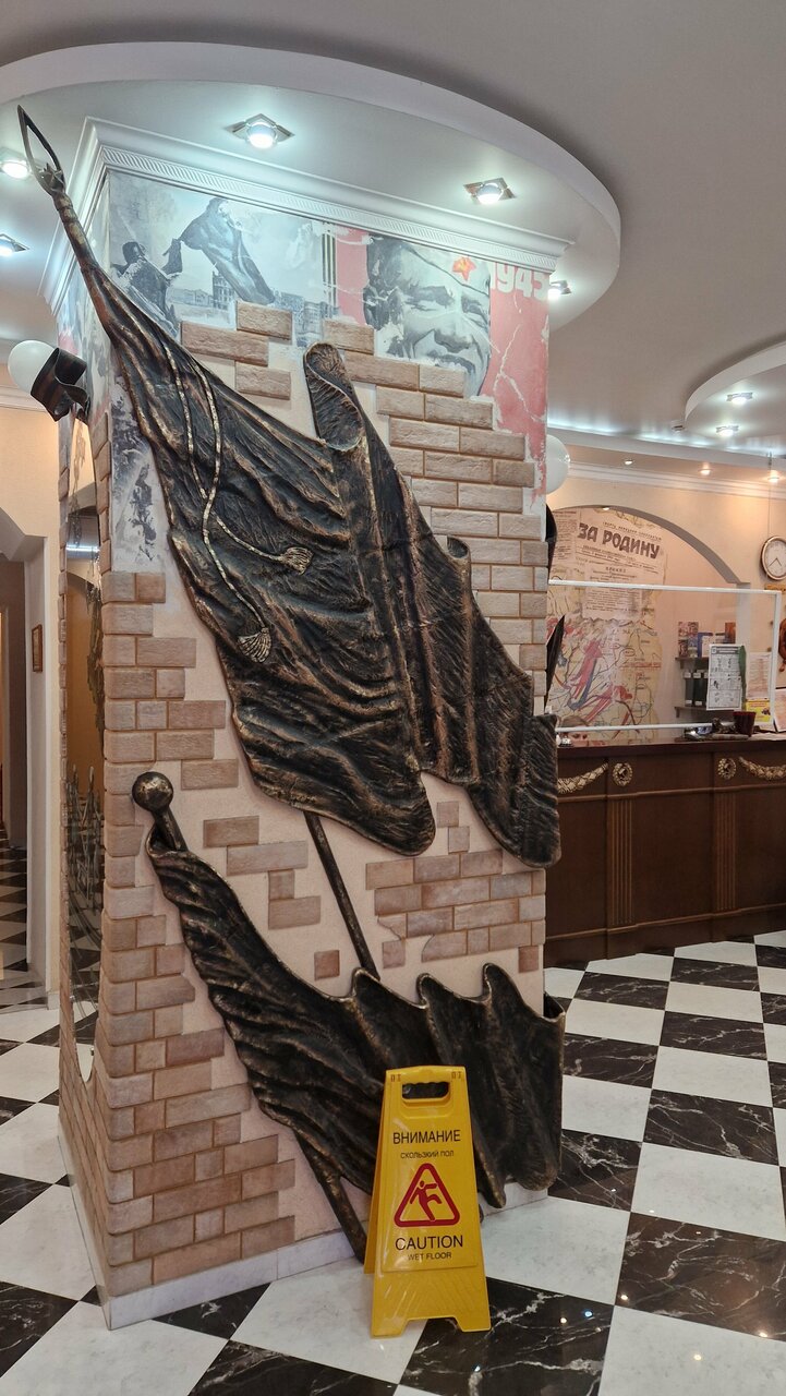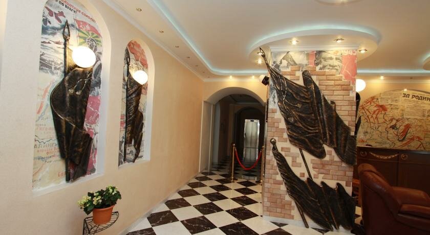 Это чудесный отель! У нас был семейный номер(на фото 1/4 комнаты).Да, может, дороговато, но есть и более доступные номера по цене. Качество от этого не страдает. В фойе сделали ребрендинг 40-х годов: плакаты, флаги, флажочки, бюсты Ленина, Сталина, газеты тех годов, автомат ППШ (его можно взять в руки и сфотаться). Первый раз нам встретилась услуга (кстати, бесплатная) : в любое время дня и ночи можно воспользоваться кофемашиной в столовой, а ещё там не убирают разные хлопья, шоколадные шарики. Чашку с кофе можно взять в номер, но просят вернуть к завтраку. Включен завтрак очееень приличный! Вход в гостиницу находится рядом с музеем( Подвал, где Паулюс сдался в плен)не с улицы, а со двора. На мой взгляд это самый лучший музей — сходите, не пожалеете. Недалеко от гостиницы есть столовая ‘Мира’- цены вас приятно удивят, качество еды супер! Такого учтивого, отзывчивого персонала как в этой гостинице, мы не видели. Все гости для них как родственники!