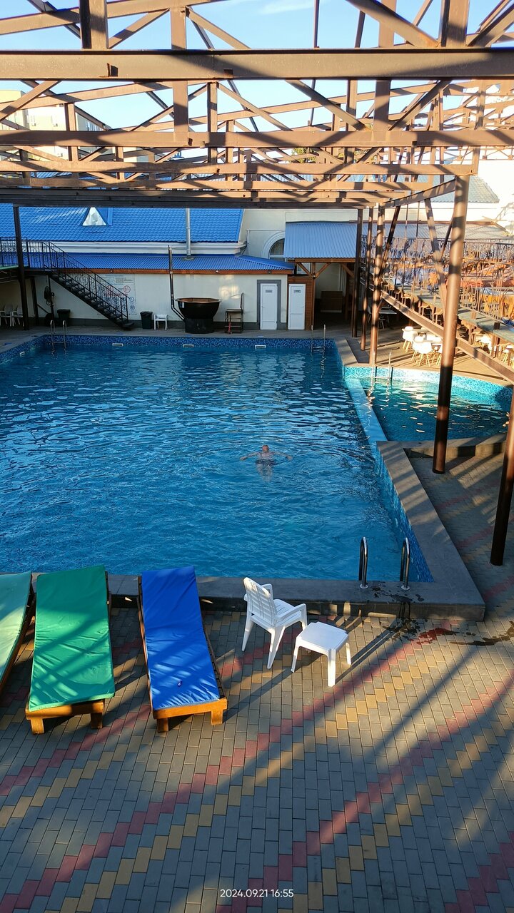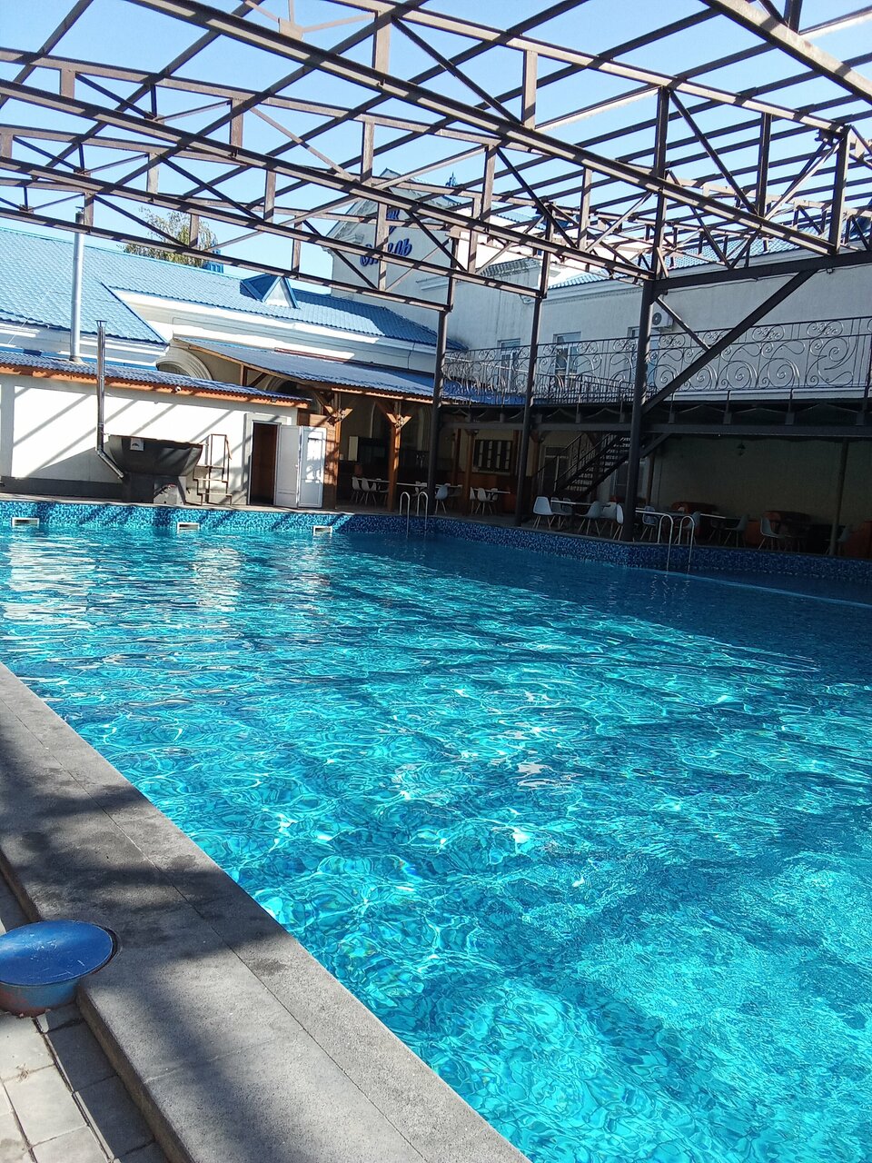 Бассейн да…это конечно фишка этого места,но когда я в нём плавал к нему с улицы совершенно спокойно подходили собаки…. номер,лично у меня был ну уставший совсем.В номерах пахнет канализацией,ну честно говоря там и на улице в радиусе километра ей сильно пахнет,такое ощущение что рядом какие то очистные сооружения. В целом остановится на ночь как я вполне можно,но надо как-то привести его в порядок.завтраки не плохо,только вот в наше время растворимый кофе….делайте зерновой хотя бы за деньги