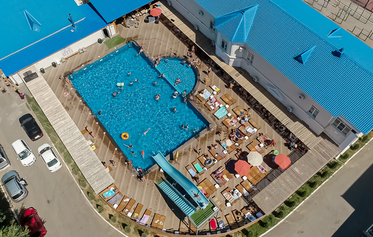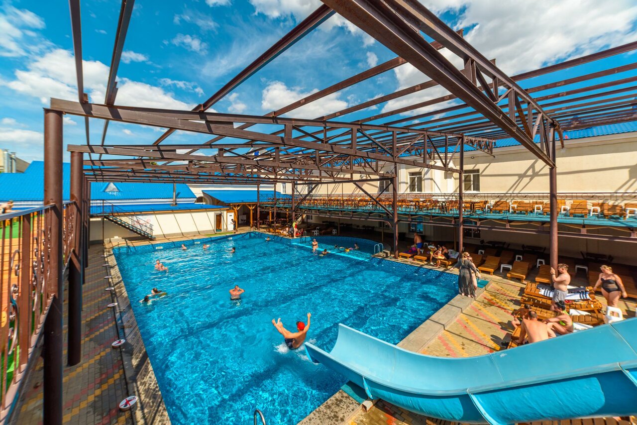 Гостиницу не знаю, но бассейн просто супер. Горка класс, сауна класс, кухня класс. 2 дня там отдыхал, всегда места были. Дети просто в восторге. Вода +35 просто комфорт, плюс пенные вечеринки. Вход в будние дни 500, выходные 700 с человека.
