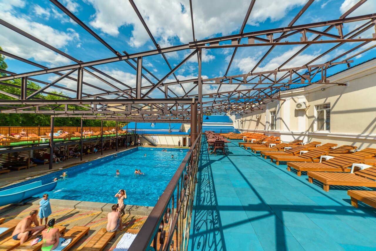 Удобства: — Номера (2000–9000 ₽/ночь) с кондиционером, Wi-Fi, телевизором, холодильником, санузлом. — Бассейны (открытый, подогреваемый, детский), сауна, баня, водные горки. — Питание: ресторан, кафе, 2 бара, завтраки, доставка в номер. — Услуги: бесплатная парковка, трансфер (платный), бизнес-центр, конференц-зал, банкетный зал, дискотека. — Для гостей: терраса, летняя веранда, камера хранения, прачечная, ускоренный заезд/выезд.