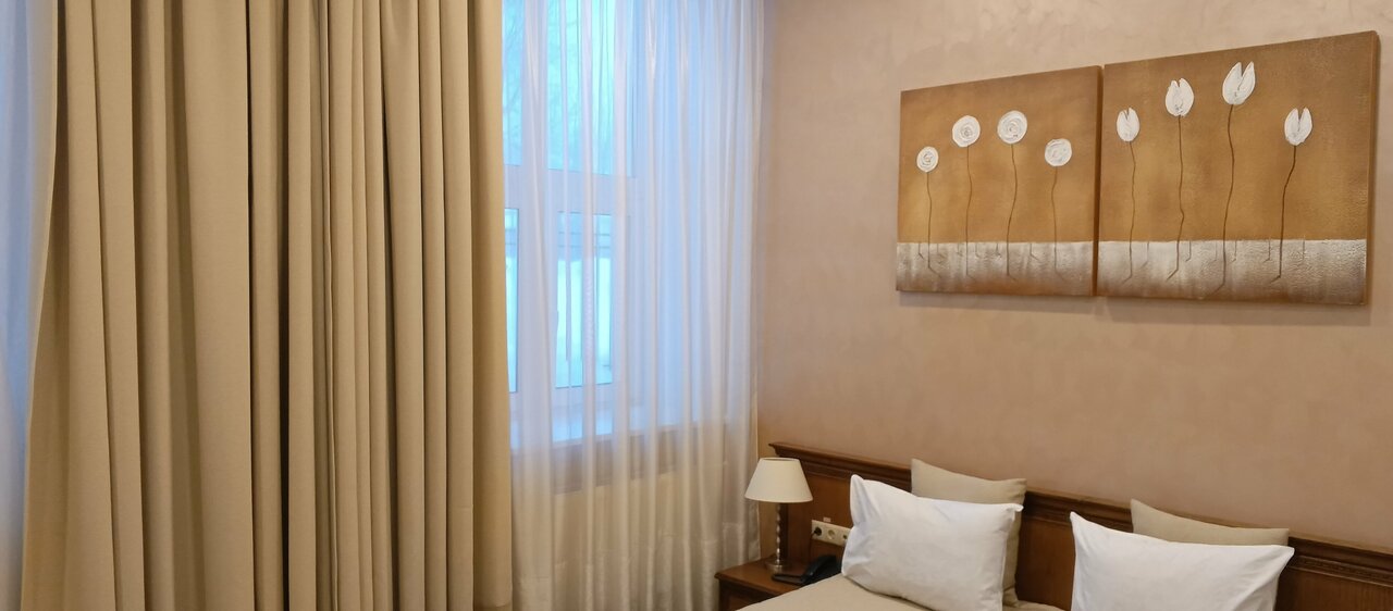 Просторный двухкомнатный номер на одного или двух человек с окнами на тихую улицу. В номере – двухспальная или две односпальные кровати