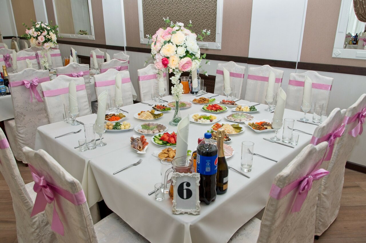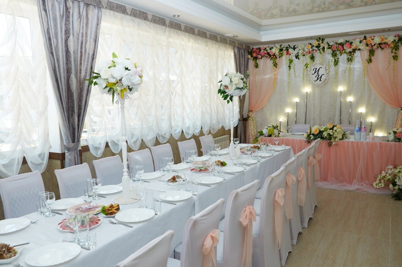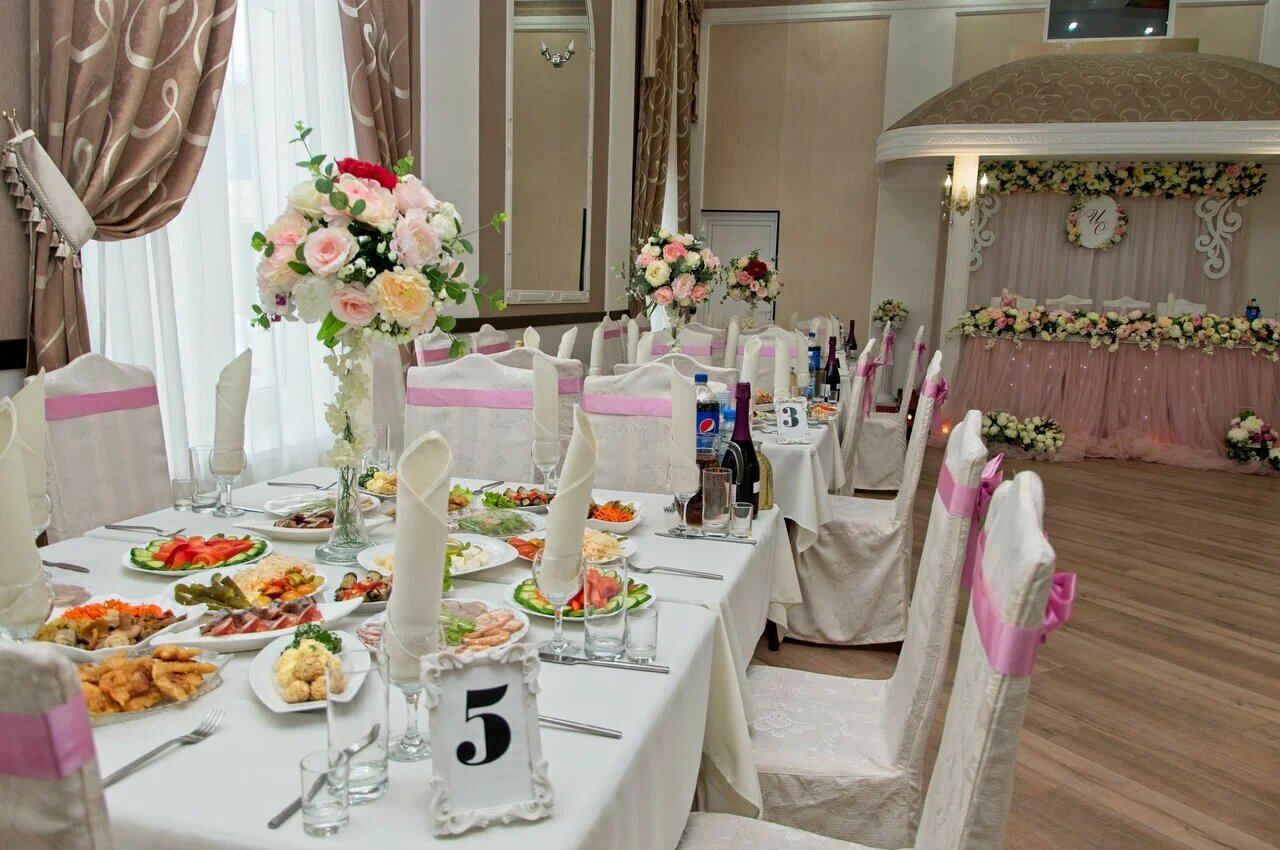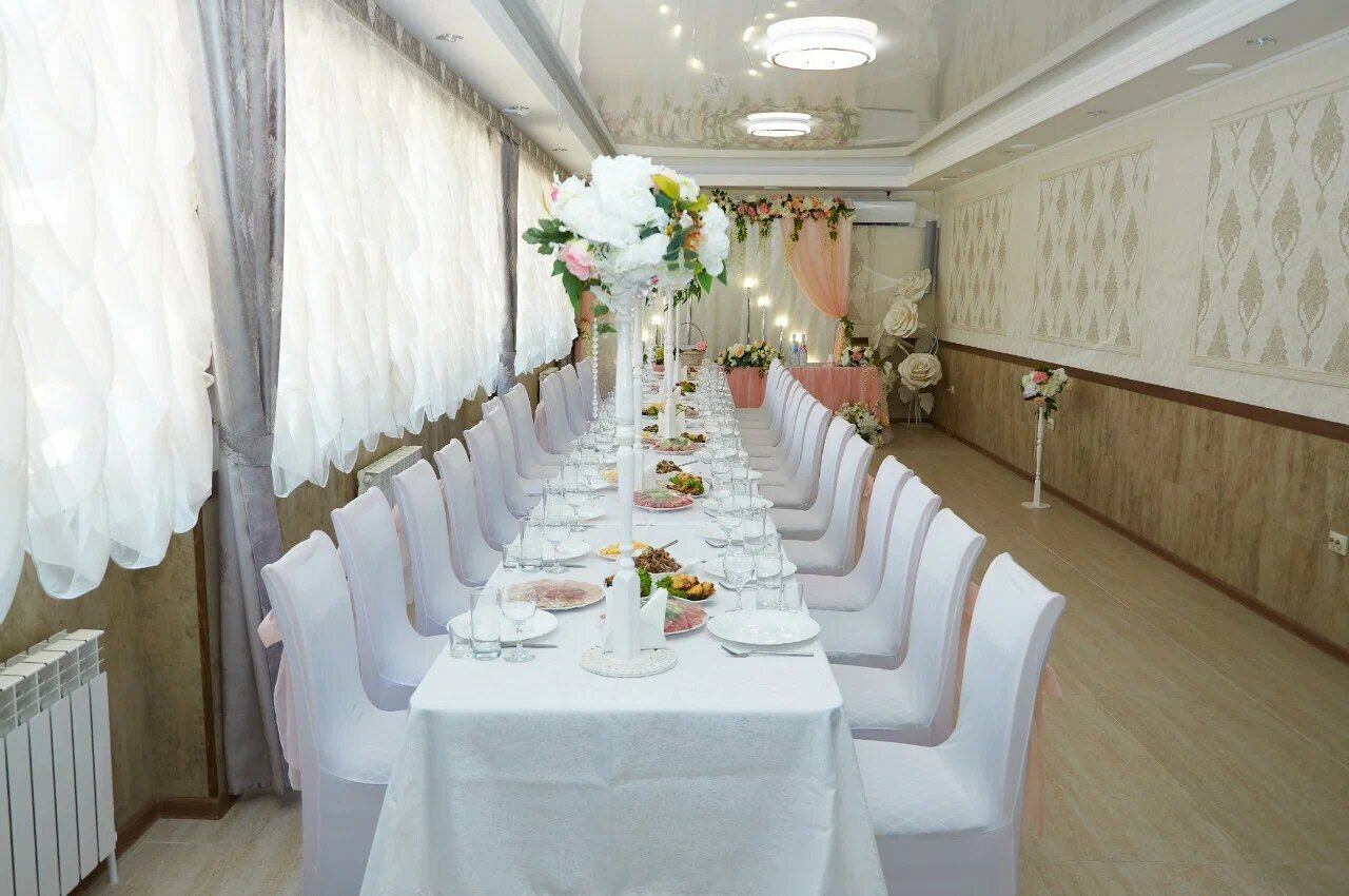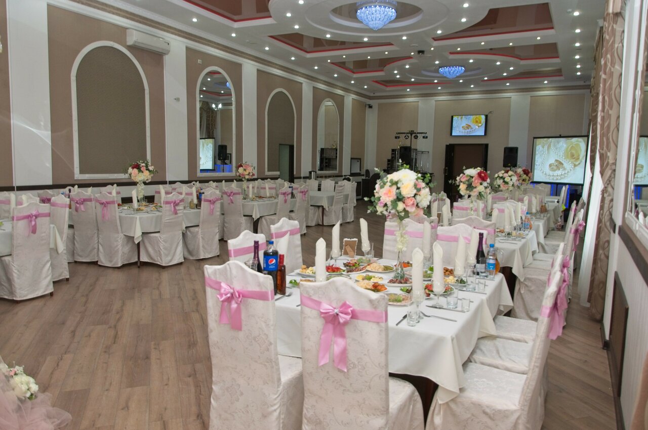 Просторное помещение банкетного зала, белоснежные скатерти и фотозона. Ненавязчивое обслуживание. Вкусно и сытно.