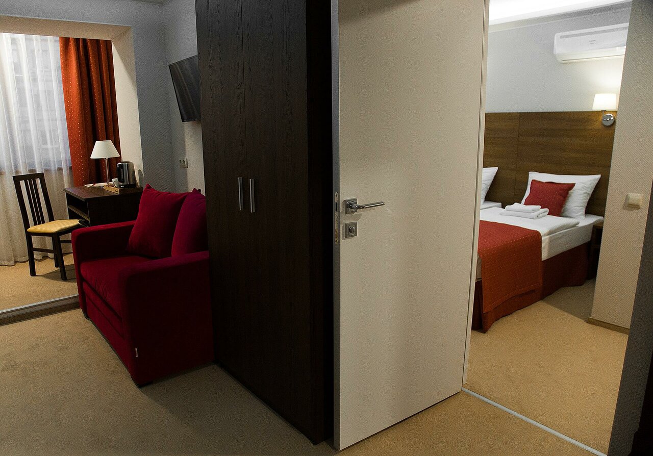 Двухкомнатный номер.В гостиной:диван, креслодвуспальная кровать с ортопедическим матрасомВо второй комнате:две раздельные односпальные кровати..Завтрак включен в стоимость номера.
