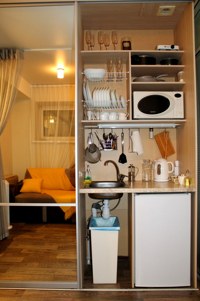 - Наличие кухни с посудой, чайником, микроволновкой.