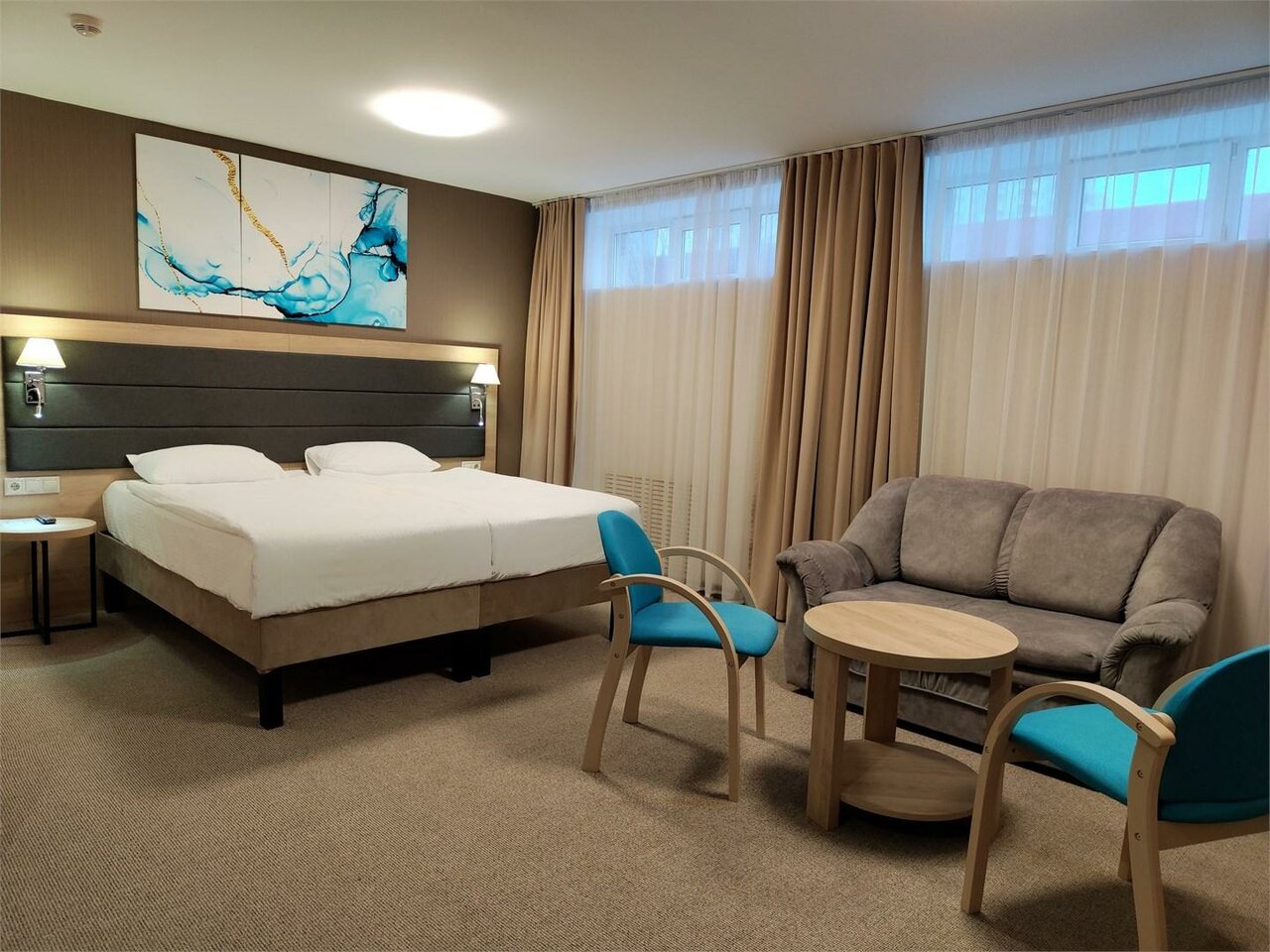 Останавливались по пути на юг и обратно на 1 ночь. Номер бизнес улучшенный, сам номер цене соответствует, ванная комната конечно немного требует более современного ремонта, но в целом для отеля 3 звезды нормально. Кровать удобная, постельное и полотенца чистые, в номере комфортно. По пути на юг поужинали в ресторане, цены ресторанные, а блюда вообще нет. Не понравилось ничего, кухня невкусная абсолютно, отдали 2700 за 2 салата, горячее и суп и после такого ужина даже не пошли на оплаченный завтрак. Так как отель на краю города рядом тоже вариантов поесть где-то почти нет. В целом оценка 4.