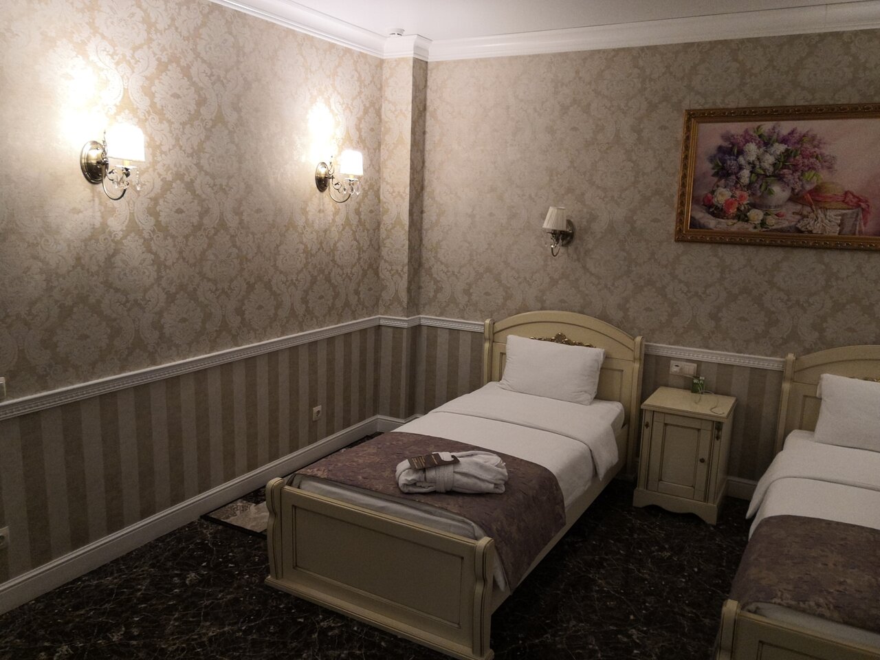 Современный отель,3***.Номера оснащены средствами личной гигиены,тапочки,фен,халаты,кондиционер,холодильник,телевизор,холодильник,сейф.В стоимость номера включён завтрак.В каждом номере двухспальные кровати.В номерах очень чисто,белоснежные постельное бельё,полотенца.Персонал вежливый,готовый удовлетворить просьбу гостей.На первом этаже находится кафе,где можно вкусно поесть.Также имеется автомоечный комплекс.