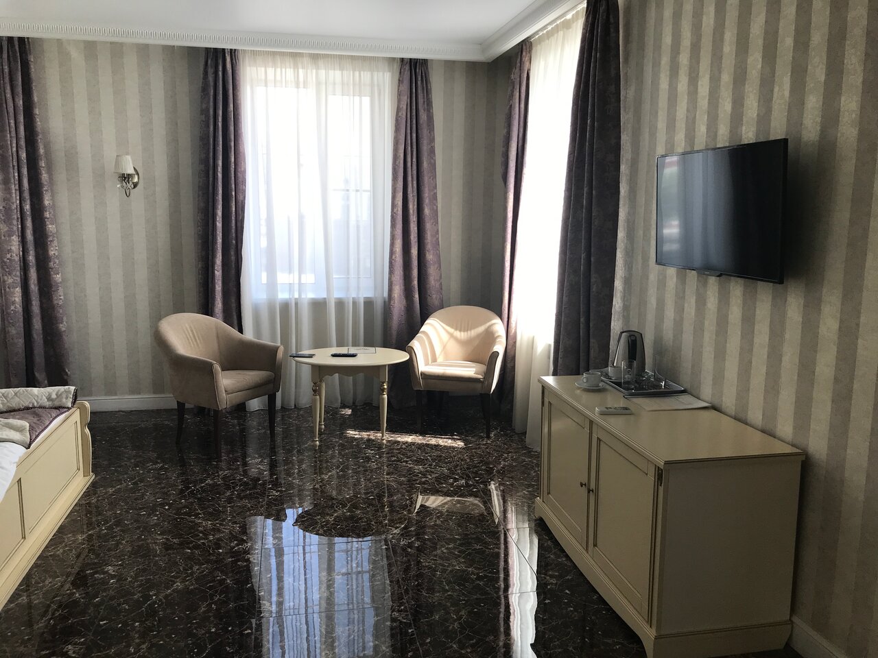 Плюсы: великолепный номер Люкс, есть халаты, тапочки, принадлежности для душа, сейф. Ресторан с большими вкусными порциями. Минусы:мойка прямо на первом этаже отеля, неудобное расположение, маленькая парковка