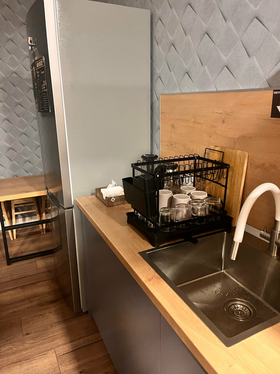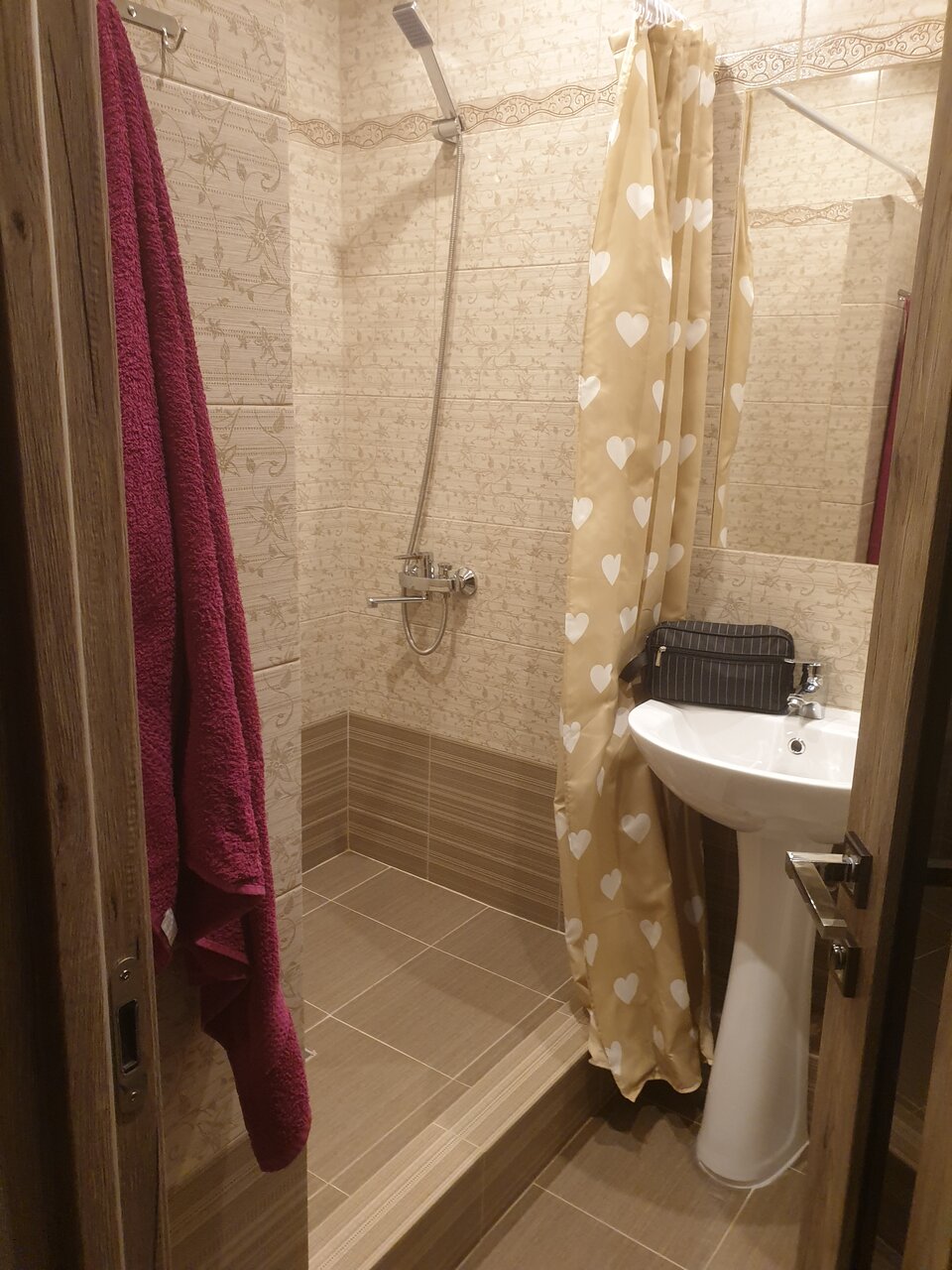 Все чисто, уютно! Но в душевой нет полочки, поэтому шампунь и все остальные принадлежности приходится чуть ли не в зубах держать. Рядом нет магазинов и кафе, поэтому о еде лучше подумать до заезда( но есть доставка пицца, суши). Чайник, кулер с водой, микроволновка, холодильник есть на этаже. В целом, мы остались довольны проживанием.