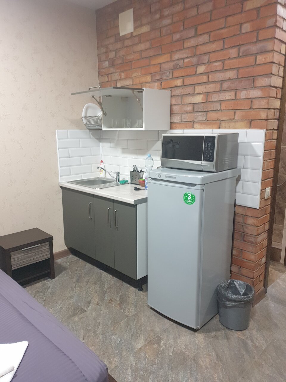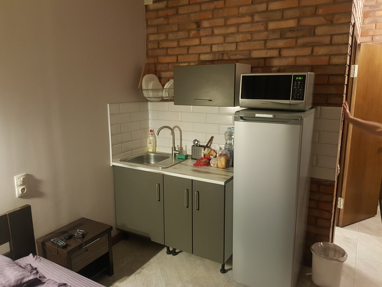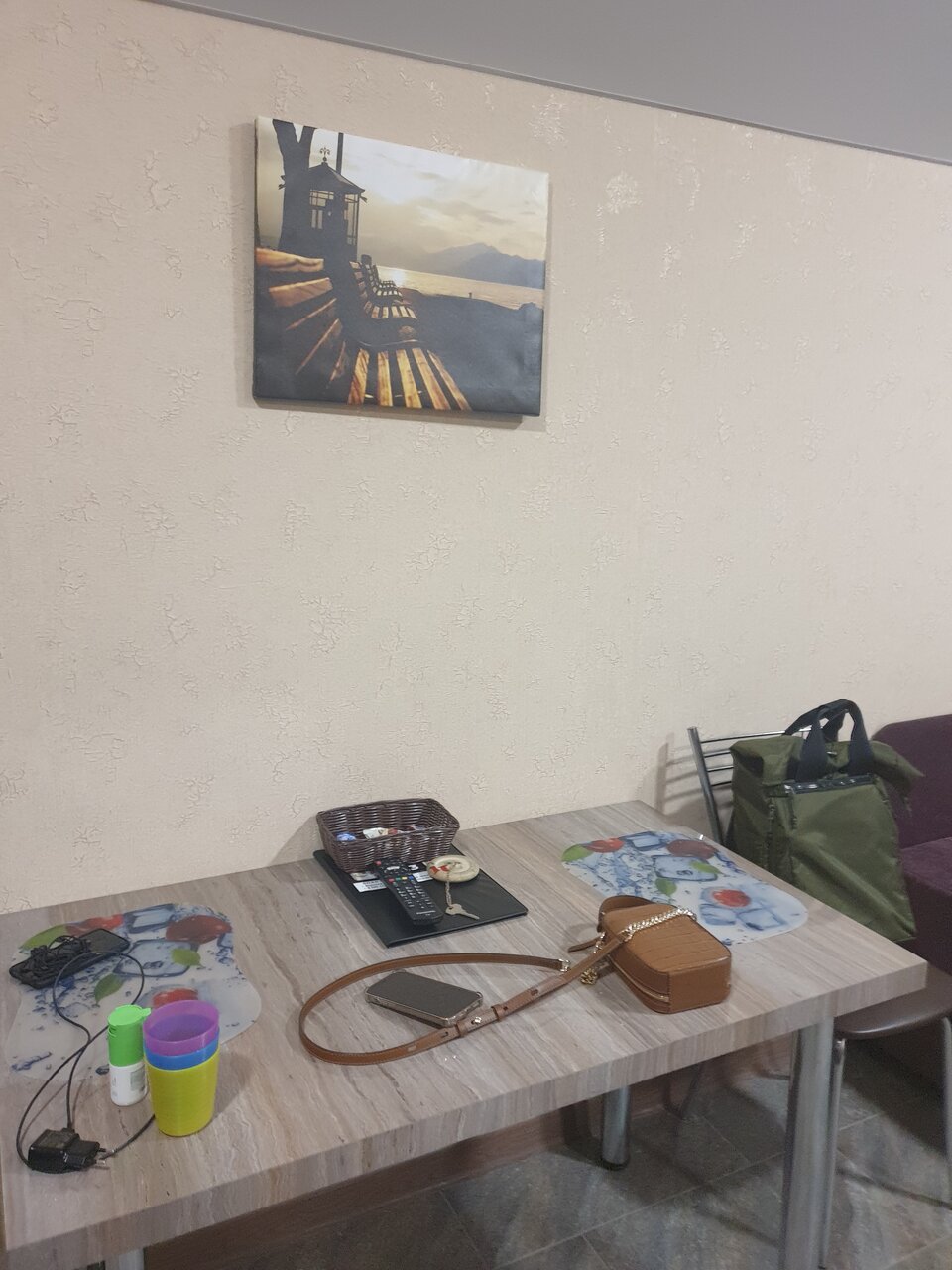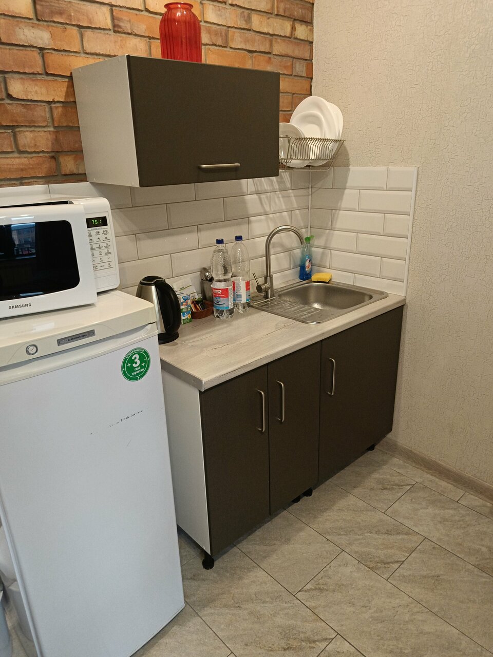 Уютно и чисто, но не хватает тряпки вытирать со стола и посуды доя готовки. По сути только чайник, посуда для приема пищи, свч и холодильник.