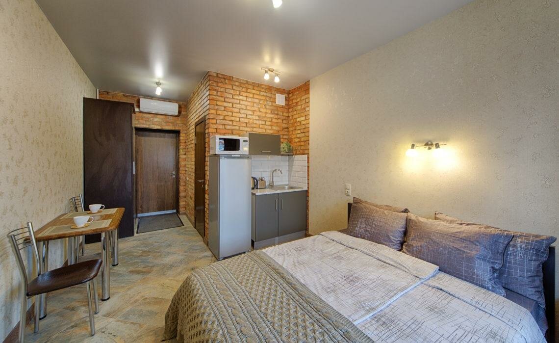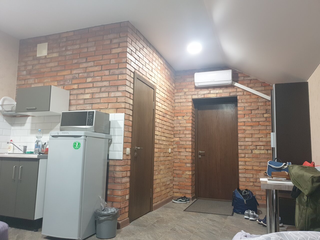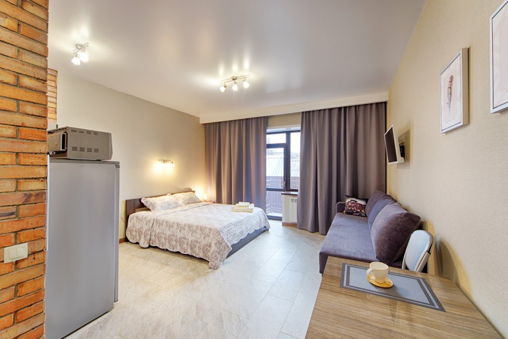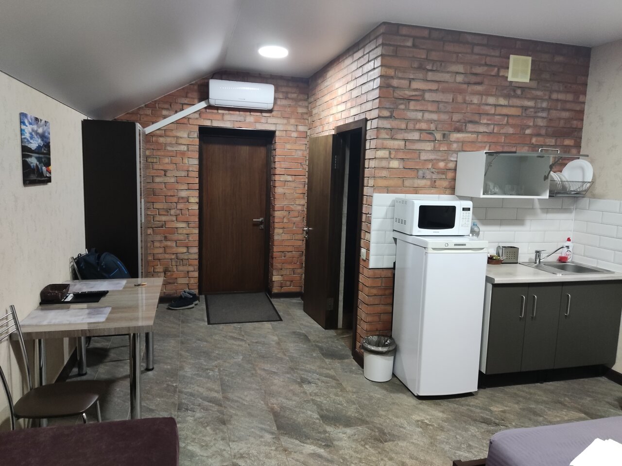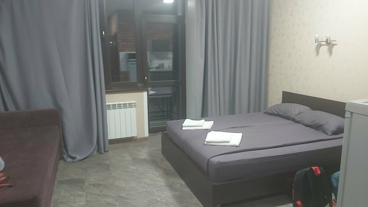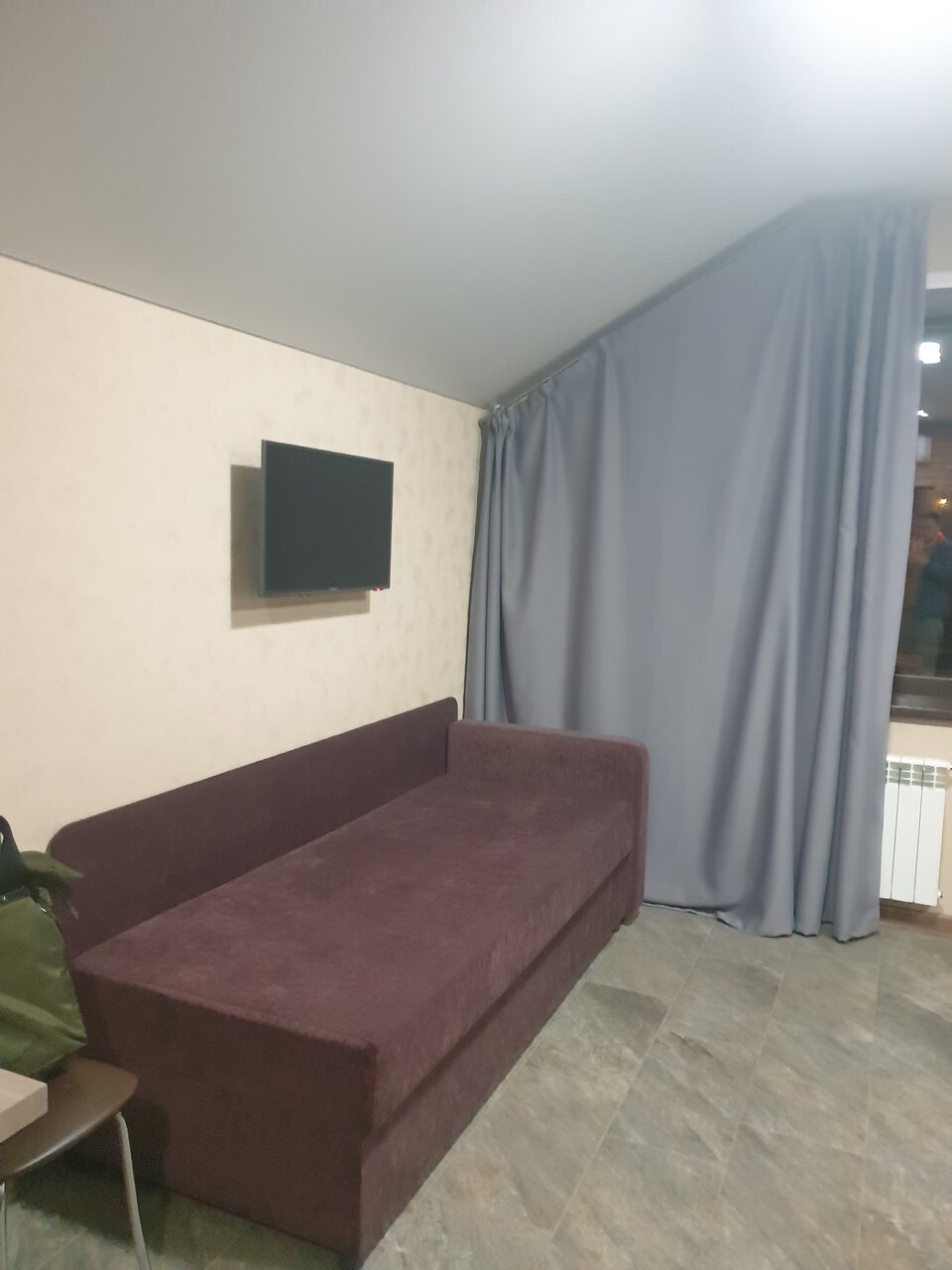 Уютный номер-студия. Нам нужно было только переночевать. Достаточно чисто, удобно. В нашем номере был балкон) Заезд и выезд в любое время!