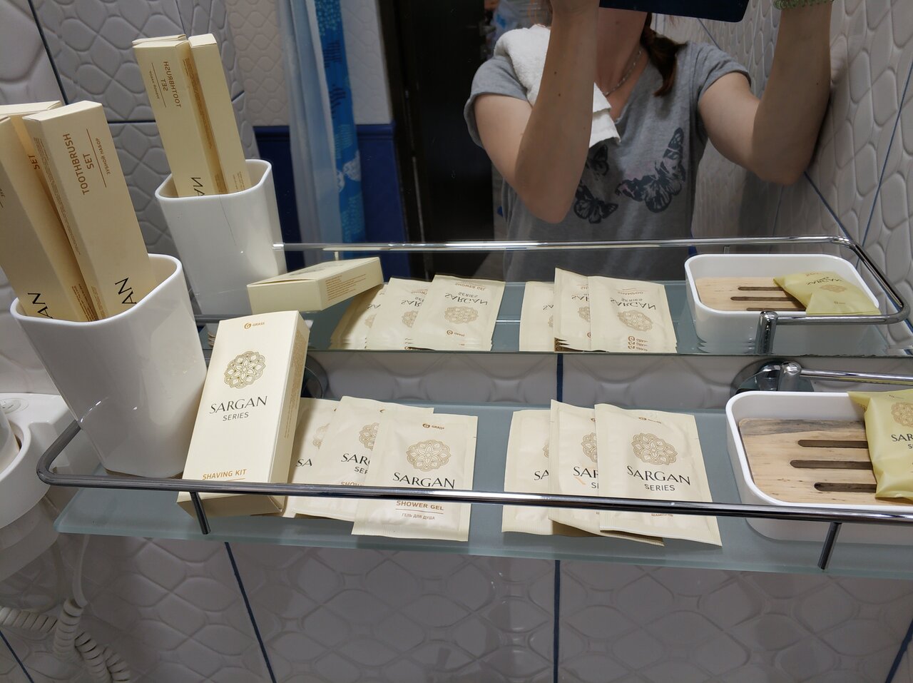 Позвонили за час до приезда , вошли в положение и заселили. В номере все необходимое : душ, кондиционер , холодильник, микроволновка, небольшая кухня, двуспальная кровать, полотенца , принадлежности для душа . Есть балкончик, а главное тут тихо — удалось передохнуть в дороге.