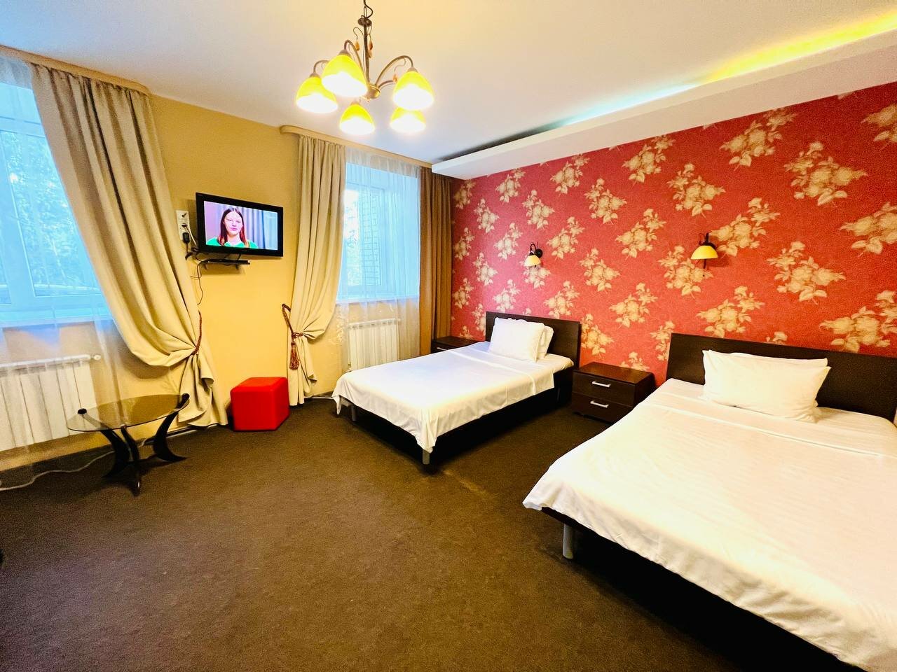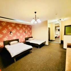 Улучшенный номер с двумя двуспальными кроватями и диваном, с собственной ванной комнатой, в котором есть все необходимое для комфортного проживания. В номере две большие двуспальные кровати и диван, собственная ванная комната. Цена от 3500-4000 руб