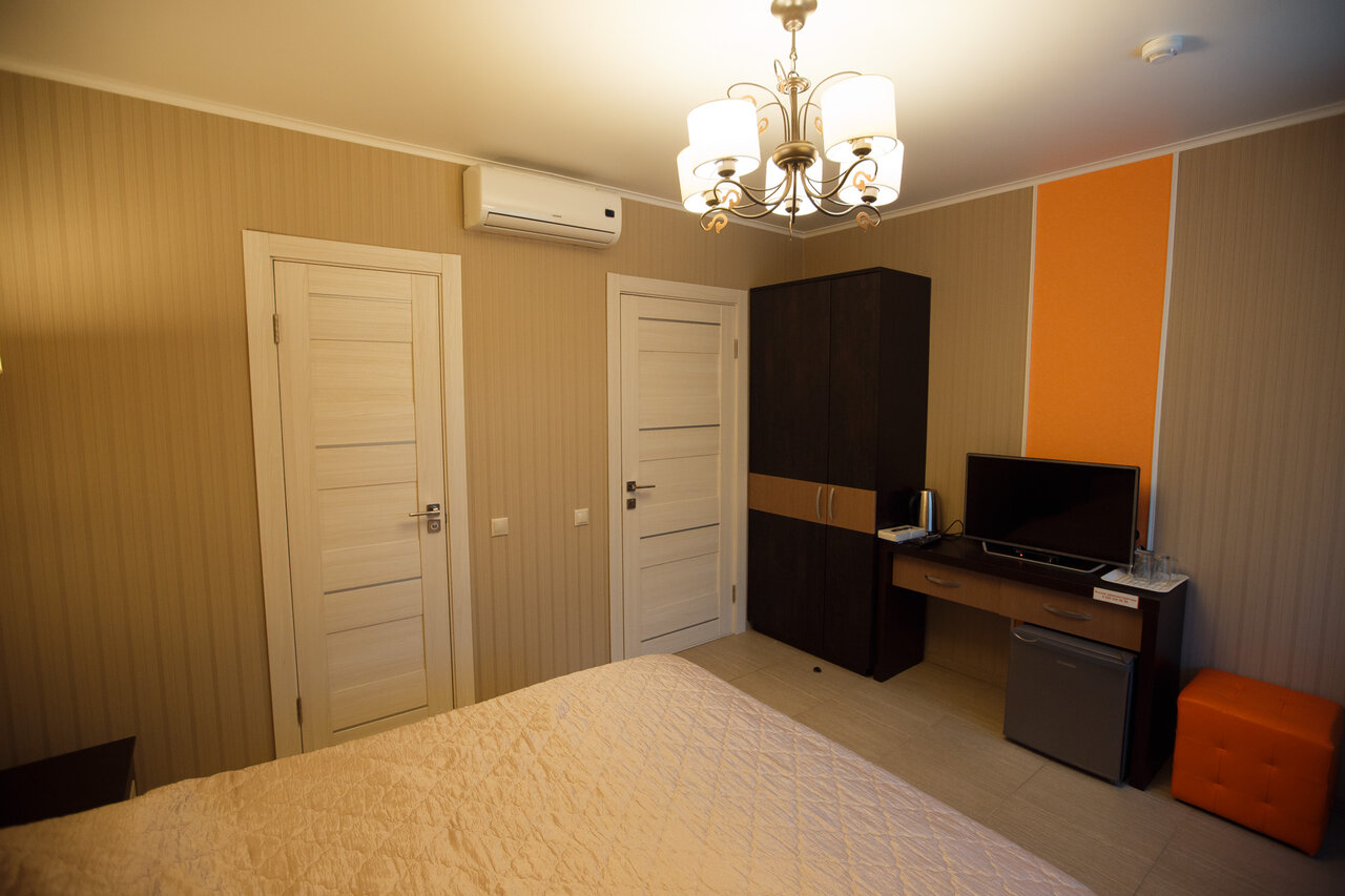 Две односпальные или одна большая , двухспальная кровать + доп место. Номер гостиницы оснащен душем, туалетом, кондиционером, феном, мини- холодильником, телефоном, плазменным телевизором, WI-FI доступом к интернету. Для наших жильцов мы продумали ка