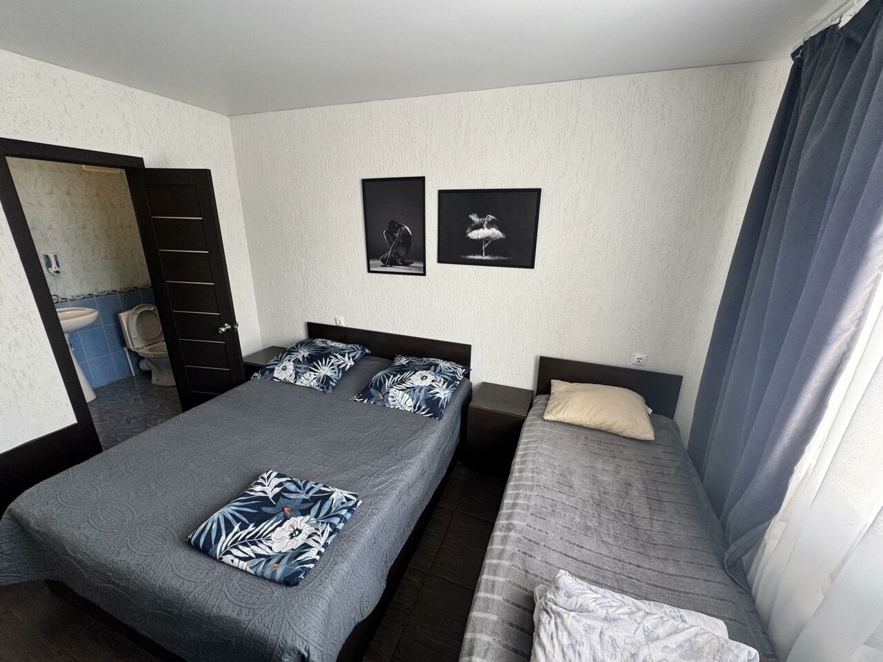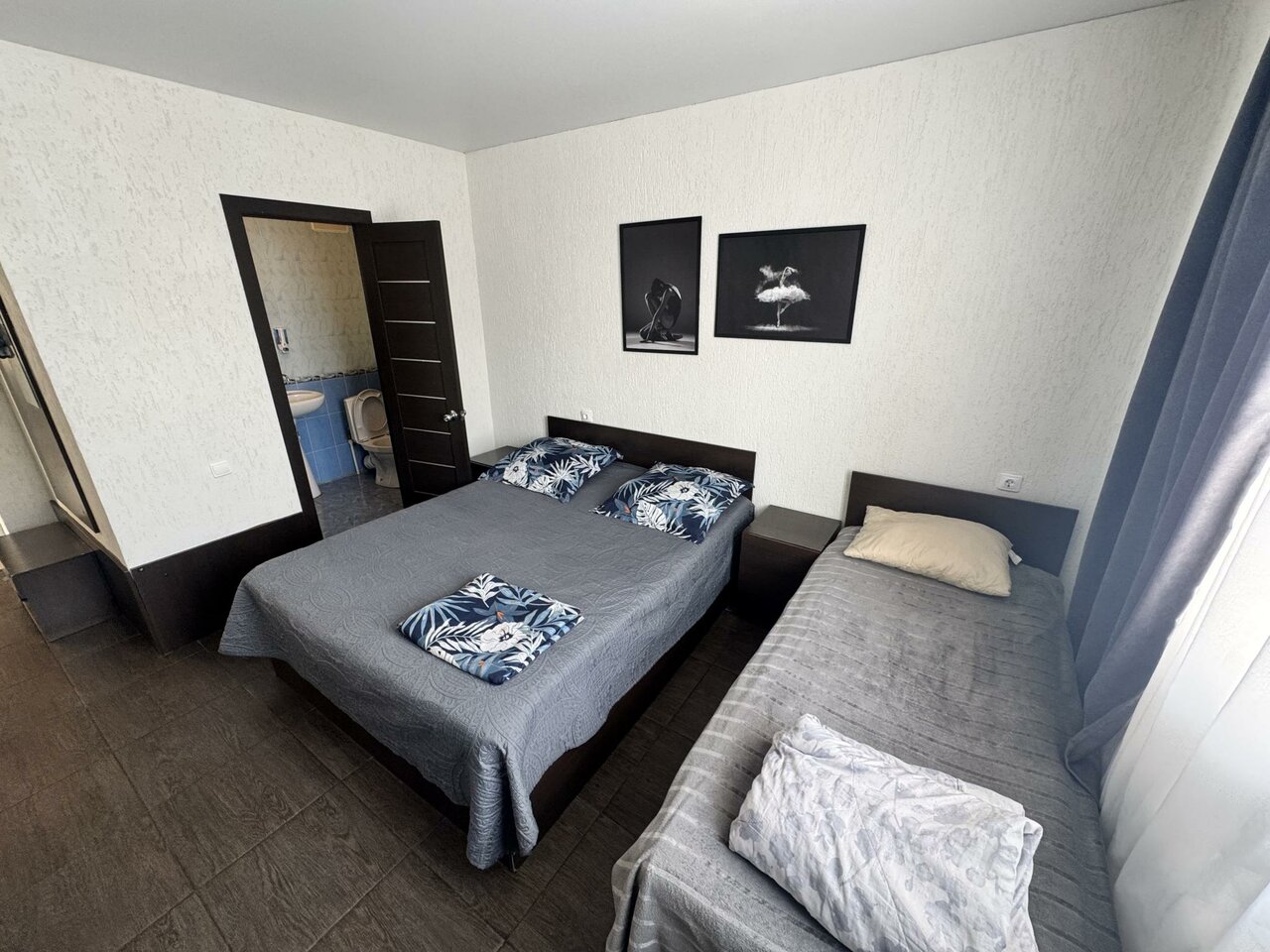 Просторный номер в гостевом доме рассчитанный на проживание двух человек. Просторный санузел с душевой кабиной, раковиной и туалетом располагается в номере.
