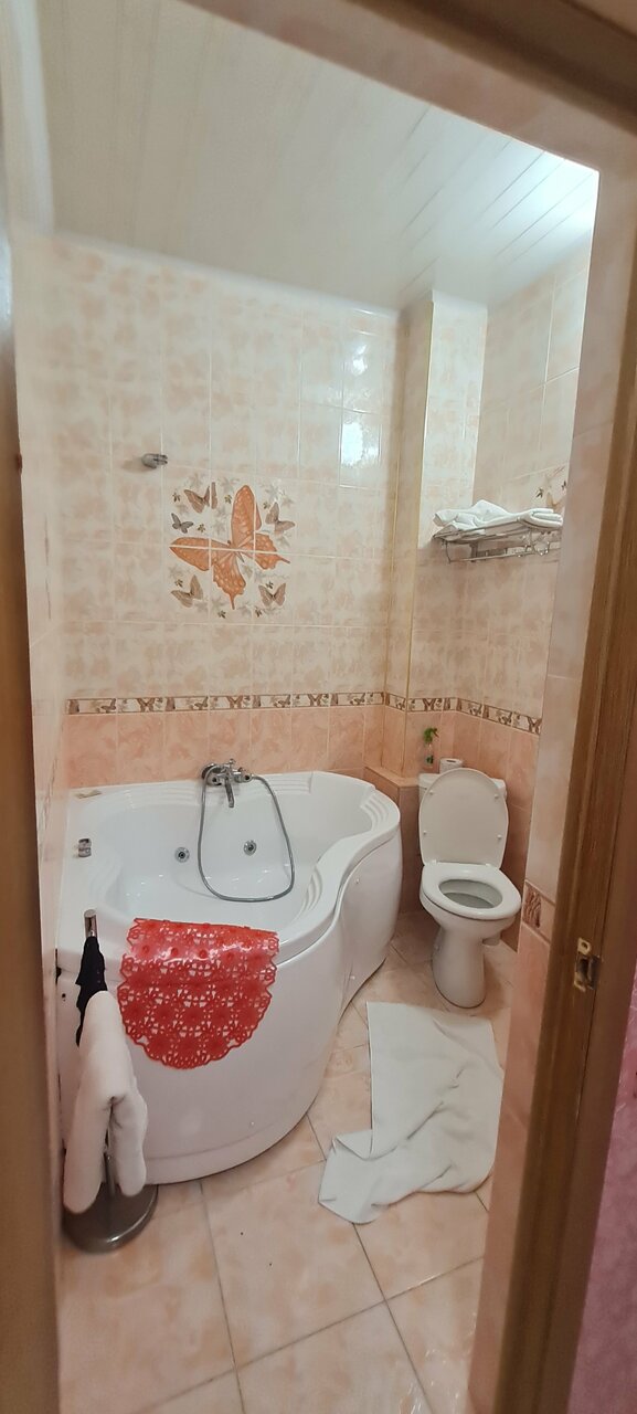 Остановились в этом отеле на одну ночь. И получили ОГРОМНОЕ разочарование!!! Это какой-то самострой на месте стройки. Во-первых, звонила заранее напомнить о парковке, заверили, что место будет. По факту , пришлось оставлять машину за воротами. И вообще парковка, это всего 3-4 места!!! Во-вторых, мы остановились в номере Императорский….это кошмар!!!! Всё вроде, как на фото…но ощущение полной антисанитории не покидали ни на миг!!! Номер очень маленький! Расположиться было негде. Шумоизоляция отвратительная! Номер находится напротив общего туалета и места для курения! Шум, ходьба по коридору, разговоры и запах- это Ваши спутники на всю ночь. Пол в номере липкий, стены грязные, вообщем касаться чего-либо лишний раз не хотелось! Ощущение какого-то места, куда привозят девушек на одну ночь…. Единственный плюс!!!!это девушка на ресепшене. Очень приятная, вежливая и внимательная. Вообщеем, с детьми , как промежуточная остановка не рекомендую.