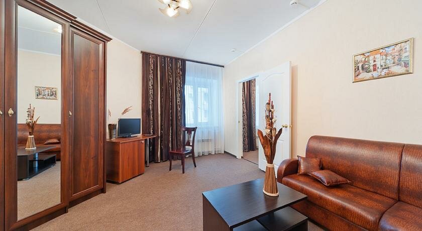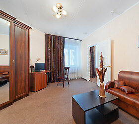 Номера категории «Люкс» рассчитаны на длительный срок проживания. Апартаменты состоят из двух жилых комнат: гостиной с полностью оборудованной кухонной зоной и рабочим местом и спальни. Цена указана «ОТ».