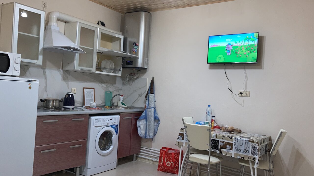Чисто, по домашнему уютно, есть необходимый набор посуды на кухне, чайник, микроволновка, холодильник. Телевизор (каналов не много) Кондиционер Всё работает исправно. Рядом с домом удобная парковка Дорога к дому не очень хорошая, ехать надо аккуратно. Хозяева гостеприимные, заселение круглосуточно. Большое спасибо!!!
