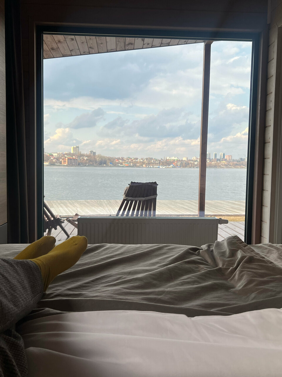 Были 22-24.11, рабочие дни. Вилла №2 с видом на реку. Все абсолютно новое, технологичное. Теплый пол, сантехника на уровне, регулируемые батареи, зеркало с подсветкой. Ничего не скрипит, даже двери при закрытии не щёлкают, замки специальные. Оценили. Минусы мелкие — был тупой ножик :). Больше реально не к чему придраться. Ну и по самому месту — Придаченская дамба. Оно интересное, но с особенностями. Поесть там зимой — это только бургерное заведение нашлось, но мы туда по времени не попали, в восемь вечера уже закрылось. Остальное — ларьки с кофе. ‘Блинчик’ не работал при нас. Завтрак с доставкой из ресторана мы не заказывали, но такая возможность есть. А вот если бы были какие-то варианты готового завтрака попроще типа ‘только разогреть’, нам бы такое подошло. Но такого пока нет.