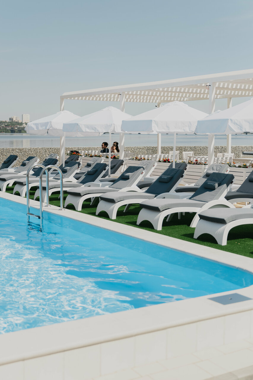Вообще место классное. Бассейн с подогревом +27 +30°. Адекватная цена, в которую входит посещение+полотенце+лежак.Прекрасныц вид на водохранилище и правый берег. Но, вот с едой и ценой на неё, здесь не очень. Бургер в районе 650 руб . За это звезду сняла.