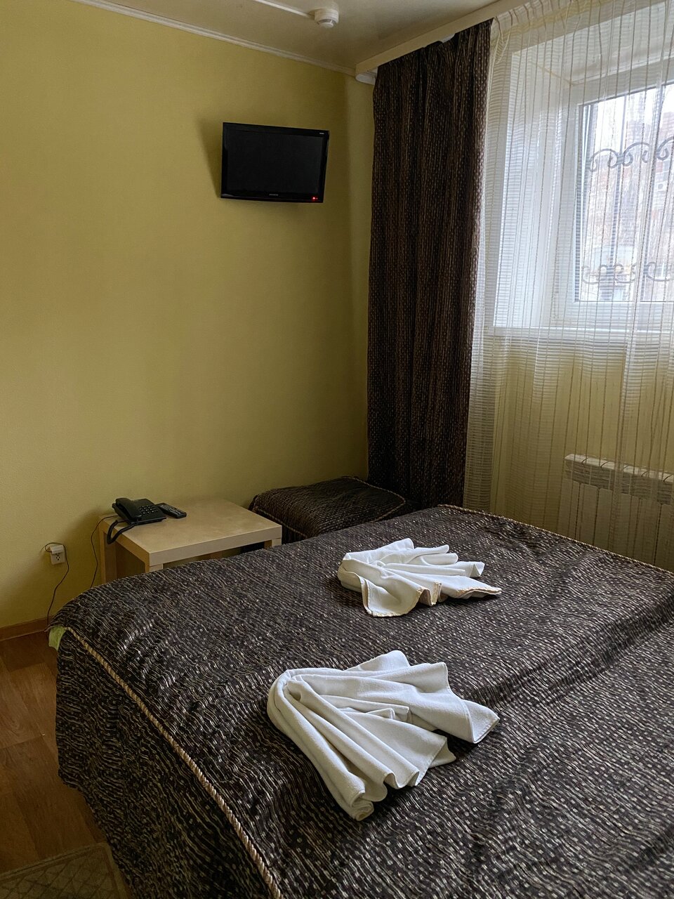 Останавливались на ночь, нам предоставили номер эконом! В целом, в номере было все необходимое-холодильник, чайник, посуда, полотенца! Но!!! Под матрацами были фантики, крошки, что-то похожее на забытые кем-то трусы! Было очень неприятно это обнаружить ((( Душевая кабинка течёт! Душ бьет в стенку так, что вода льётся на пол фонтаном через шов! Пришлось устранять потоп выданным полотенцем! Ночью спать было не очень комфортно, так как за окном изрядно выпившие мужчины очень веселились! Из плюсов: доброжелательный приём на ресепшене, обещали принять меры