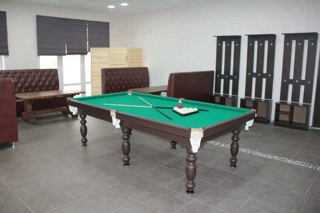 - Просторная зона отдыха с бильярдом и большим столом.
