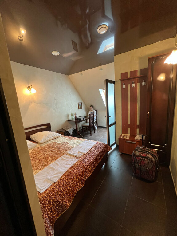 Гостиницей это назвать сложно! Оставались на ночь по дороге в Москву. Отель похож больше на ночлежку. Одеяло грязное, в пятнах, окно в потолке, плохая вентиляция. Туалет и душ это отдельная тема, маленькая раковина, где невозможно даже щетку расположить, не то, что туалетные принадлежности. ДУШ над унитазом, возможно идея в том, что можно делать 2 дела одновременно, но вряд ли, шторка ‘да есть’, но она никак не помогает, так как лейка прям из потолка ( т.е если вы хотите что-то точечно помыть, у вас не выйдет). Дверь не герметичная, в комнате вода, после использования душа. Муж высокий, чтобы воспользоваться туалетом, ему нужно было сгибаться в три погибели. Кровать жесткая. Единственный плюс, нас смогли заселить поздно ночью и повезло, что было достаточно тихо ( видимо никого не было). Но на утро мы постарались скорее сбежать из этого ‘отеля’