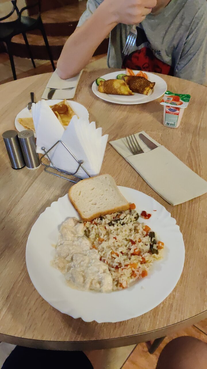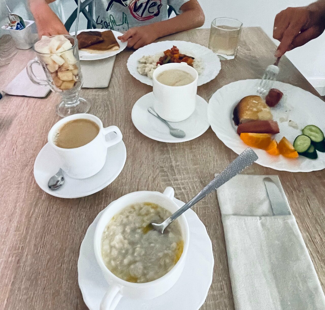 Общее впечатление хорошее. Есть недостатки. Мелкие неисправности дверей, на входной болтается ручка, дверь в санузел покрасили и она перестала закрываться, двери в душевой кабине висят на верхних роликах, а нижние просто висят рядом. Нет кулера. Есть электрический титан, чайник и кувшин с кипячёной охлаждённой водой. Очень сложно. Завтраки весьма скромные. Сытный мог бы быть и посытнее. Такое чувство, что рис экономят.