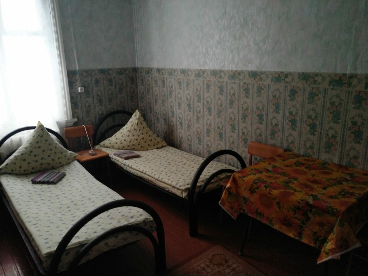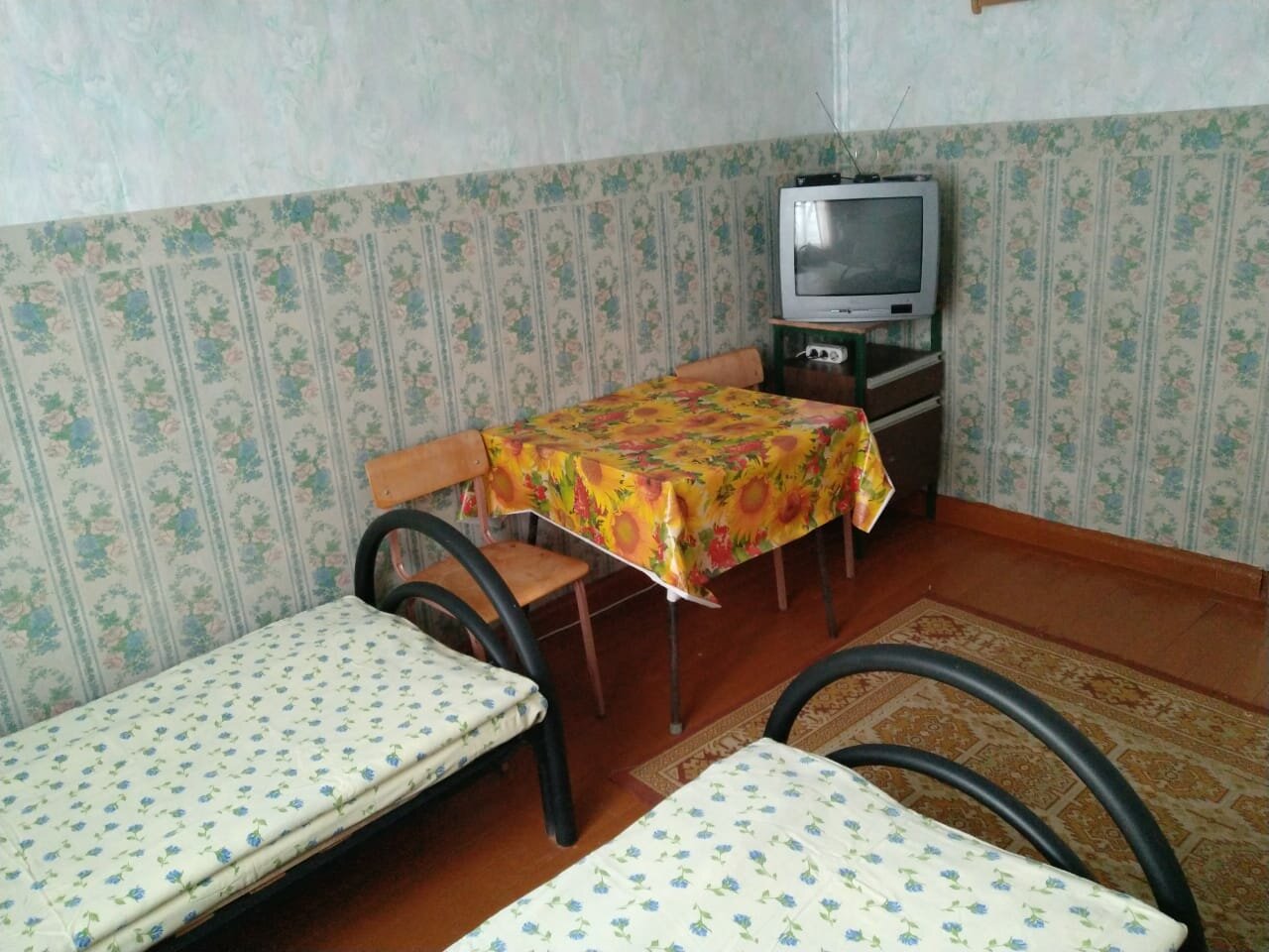 Услуги: — Номера от 800 ₽/ночь (время заезда/выезда — 12:00). — Бесплатные Wi-Fi и парковка. — Общая кухня (плита, микроволновка, чайник), холодильник, телевизор. — Душ, общий туалет, уборка, утюг. — Номера для некурящих, без питания.