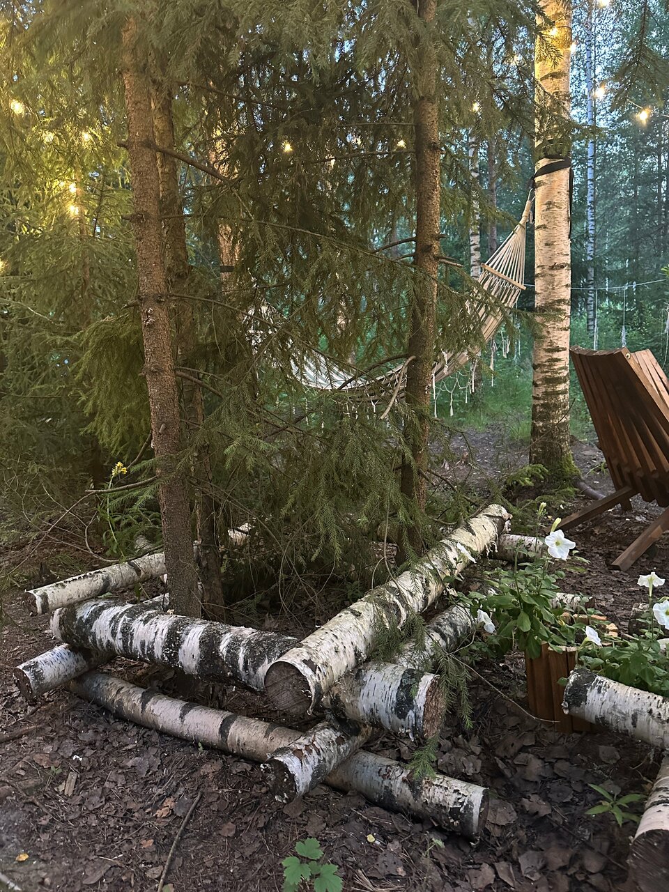 Очень хороший дом в лесу. Внутри очень уютный так же как и на участке. На участке есть деревья и растения. Дома большая кровать и диван. Можно жарить шашлыки, и сидеть на лавочке. Мне все понравилось.