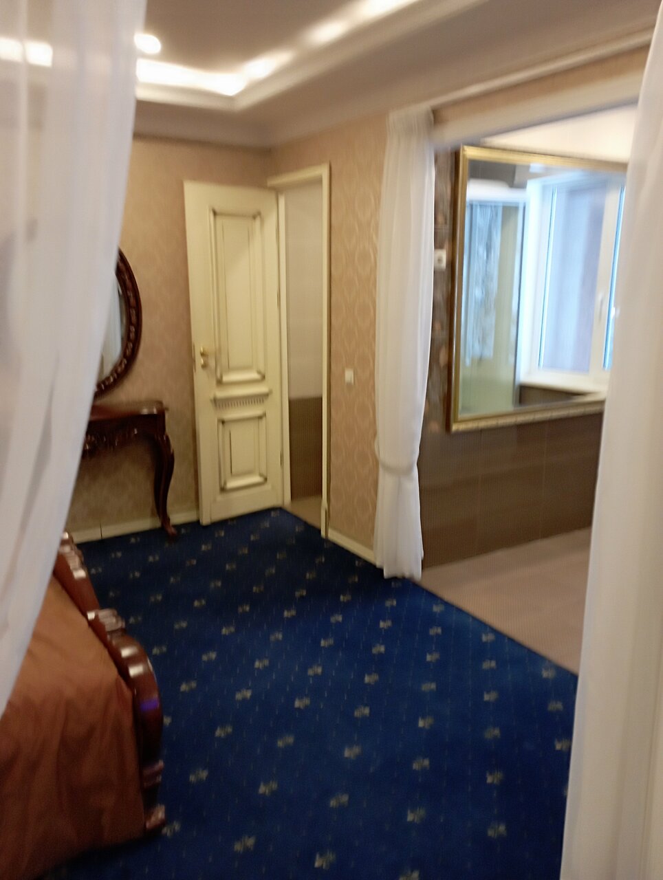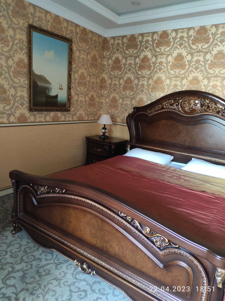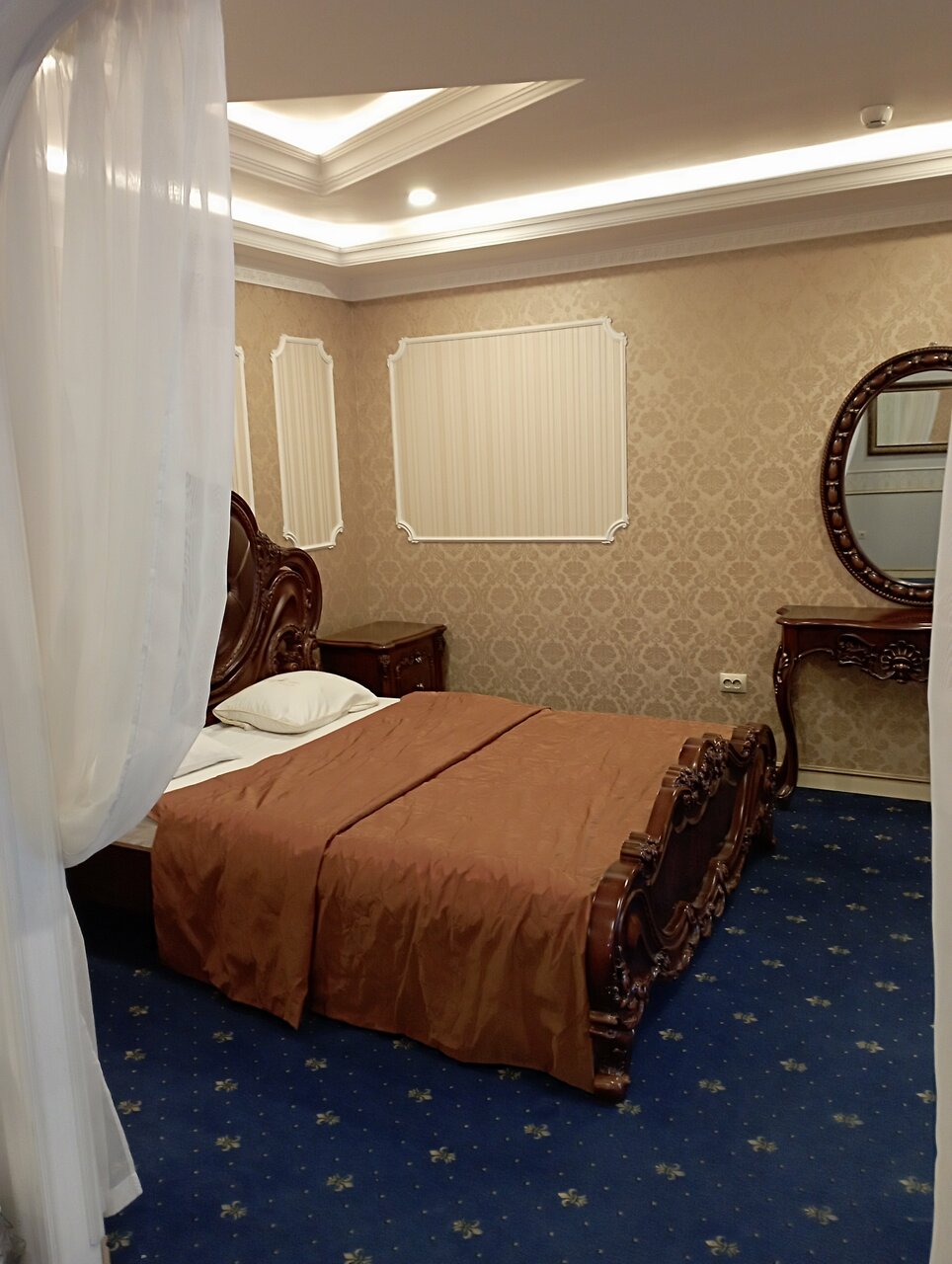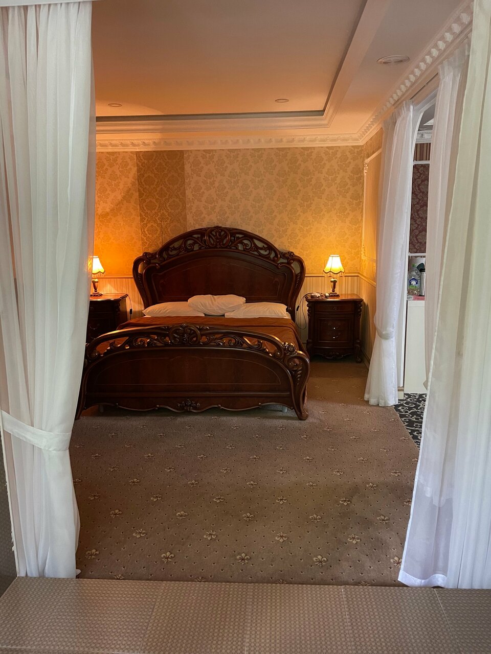 Поставил 4 и то это с большой пребольшой натяжкой. Интерьер дорого- богато, цыгане такой любят, я не очень. Спа / зона требует генеральной уборки с мощными чистящими средствами, мы зашли и вышли, за переживали что нибудь там подхватить( пахнет сильно кошачей мочой там кстати), номер пойдет , мы не царские особы и не такое видели, бывало и похуже, нооо требуется везде уборка, какое то чувство захламленности не отпускает тебя. Простыни застиранные до дыр, подушки бы надо поменять, одна ничего была вторая каменная. Телевизор включали не пультом а кнопками сбоку, ибо пульт не от него был. Ну а так то пафосно, ванная вся такая царственная , встанешь в ней и в окошко можно свои прелести показывать , хорошо хоть не жилые дома а хозяйственные помещения. По еде плохого не скажу ничего, особо не озадачивали кухню, ужин заказали в местечковом кафе — шашлычок. Короче в целом требует ремонта и уборки эта база отдыха. Больше подходит не для отдыха, а для утех, понимаете куда я клоню.
