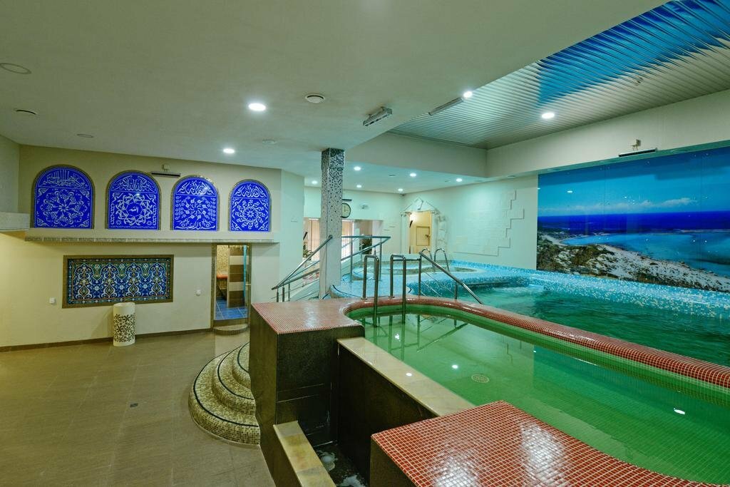 Удобства: — Крытый и открытый подогреваемые бассейны, сауна, хаммам, джакузи, spa, массаж — Ресторан, кафе, 2 бара, летняя веранда, диетические завтраки — Бесплатная парковка, Wi-Fi, трансфер (включая аэропорт) — Детская площадка, аниматоры, караоке, бильярд, конференц-зал — Проживание с животными (платно), номера с мини-баром, телевизором, феном, сейфом