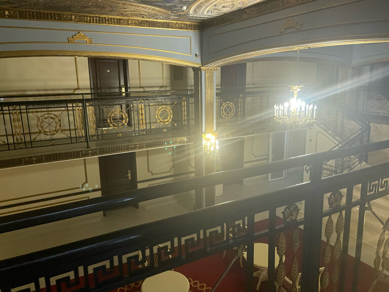 - Красиво расписанный потолок (дворцово-храмовый стиль).