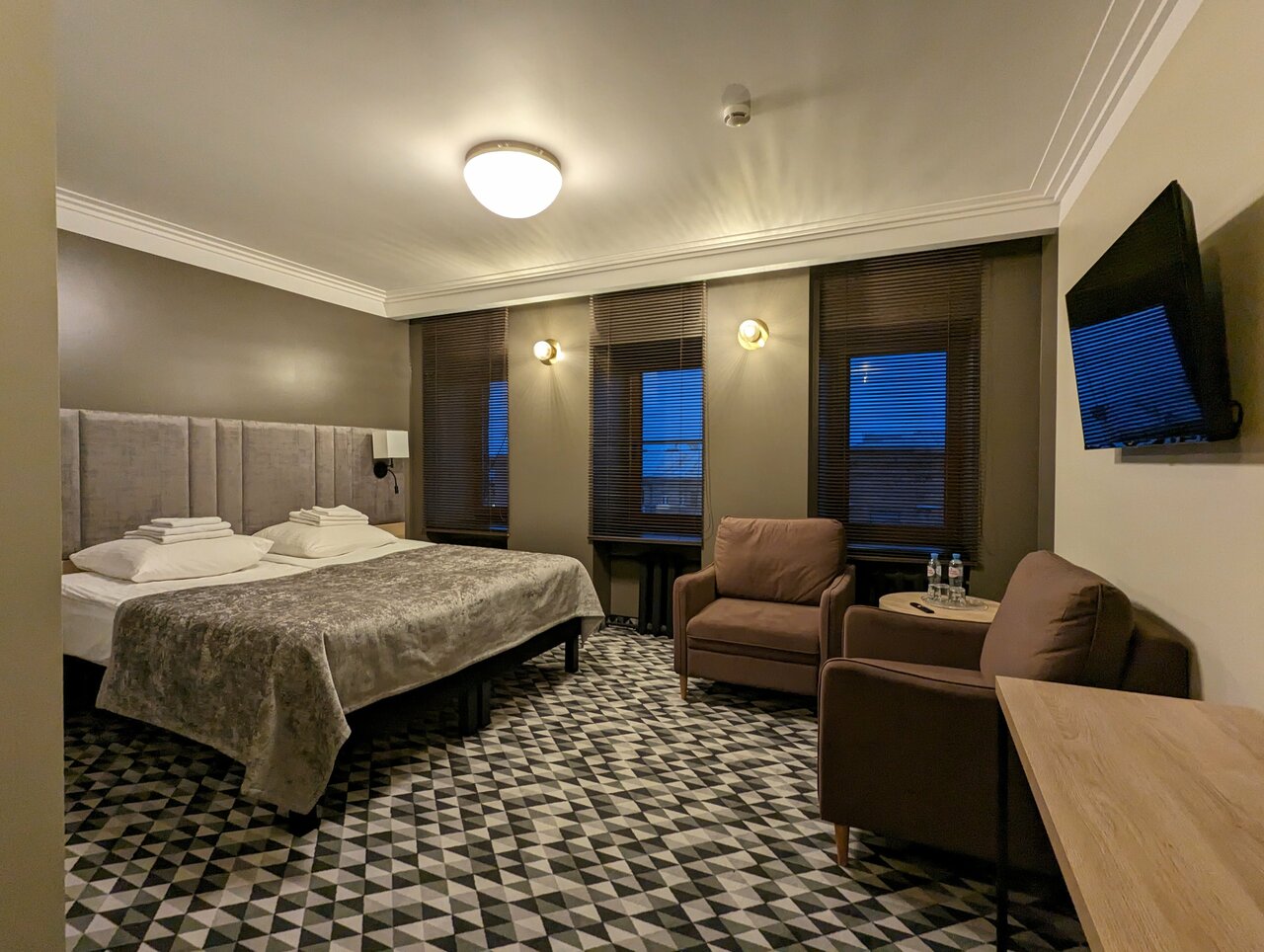 Отель соответствует своим звездам. Прекрасная локация. В близости от жд вокзала, прямо по улице от главного входа. Центр города рядом. Завтраки хорошие. В принципе все есть, что нужно, чтобы сытно покушать. Омлет, колбасы, сыры, хлопья, чай в ассортименте, выпечка и др. Ресторан на 2 этаже. Большой минус в том, что нельзя оставить багаж. Место есть. Дают ключ на ресепшене. В комнате полки. На полу валяются какие-то вещи. Администрация не несёт ответственности. Никто не контролирует процесс, потому не рискнули оставить до вечера. Выезд до 12, а из Выборга уезжали вечером. В целом впечатление не плохое. В номере телевизор, фен есть, мыло, шампунь, гель для душа. Заселили чуть ранее около 14 часов