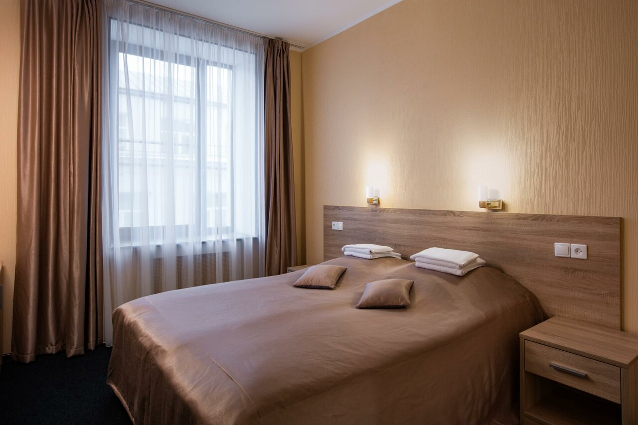 В номере: телевизор, телефон, душ, туалет, кровать, обои и ковролин, фен, Wi -Fi, на окнах - шторы. Окна номеров выходят на тихую дворовую территорию. Площадь номера составляет 15 м2.