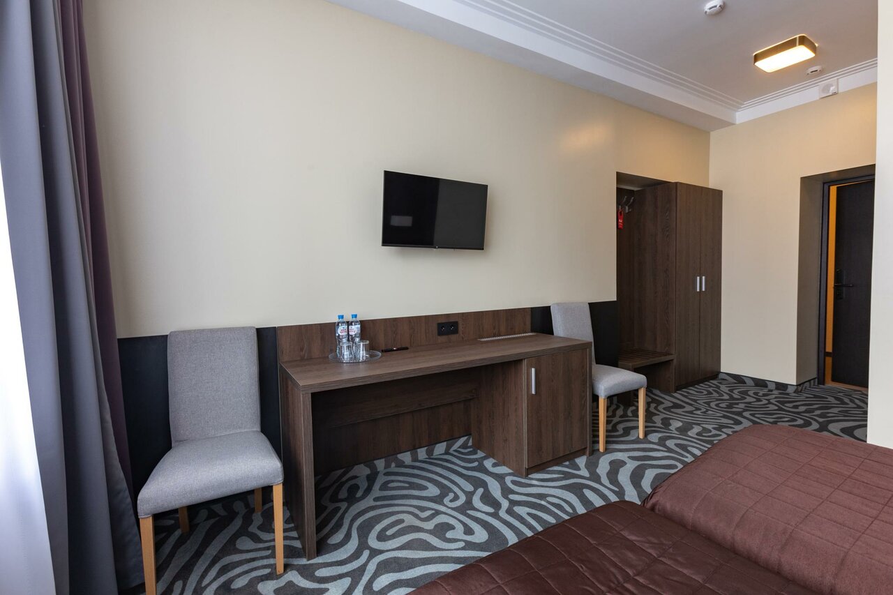 В номере: телевизор, телефон, душ, туалет, 2 раздельные кровати, обои и ковролин, фен, Wi -Fi, на окнах - шторы. Окна номеров выходят как на центральный проспект города, так и на тихую дворовую территорию. Площадь номера составляет 15 м2.